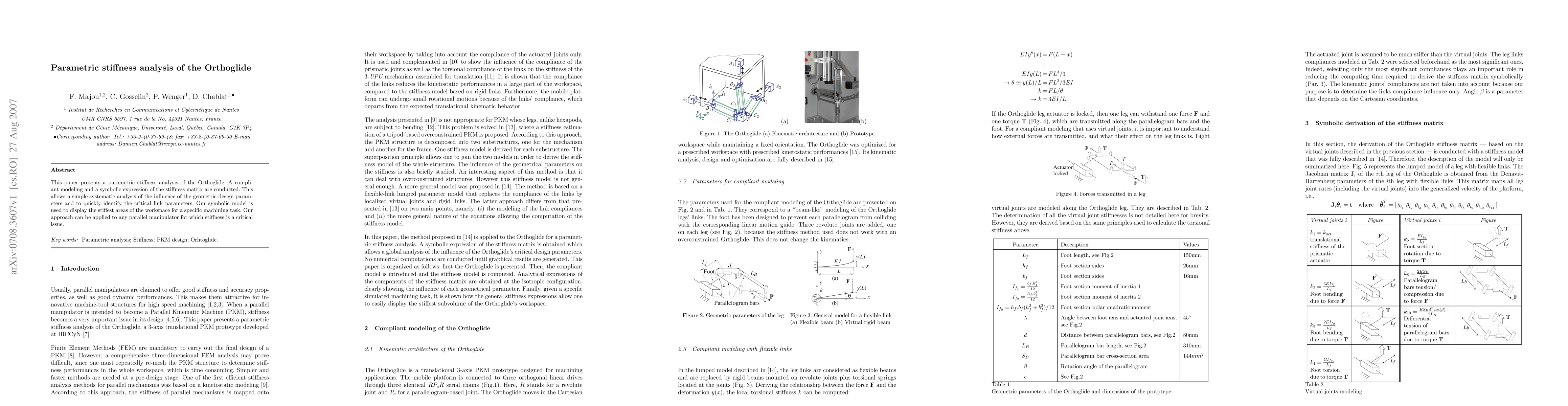 This paper conducts a parametric stiffness analysis of the Orthoglide parallel manipulator, utilizing compliant modeling and symbolic expressions to identify critical link parameters and the stiffest areas of its workspace for specific machining tasks. The method is broadly applicable to any parallel manipulator where stiffness is crucial.