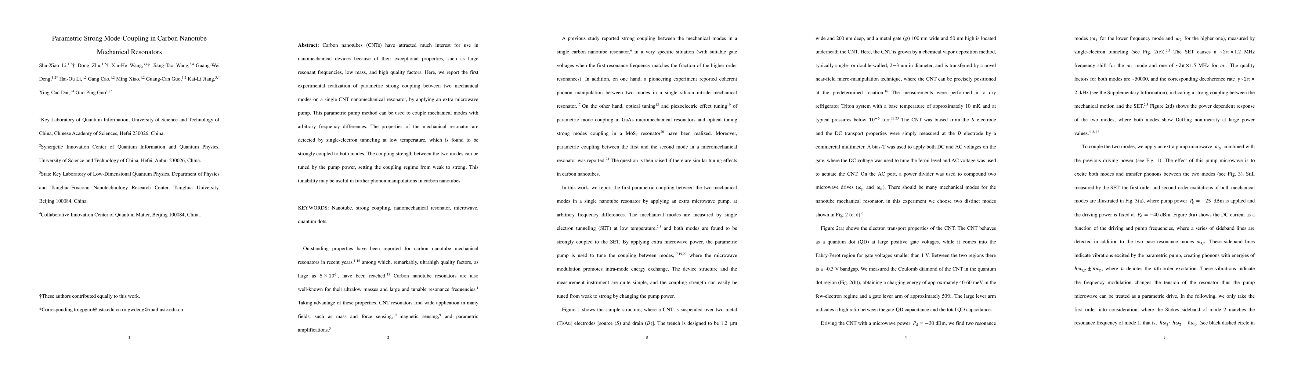 This paper reports the first experimental demonstration of parametric strong coupling between two mechanical modes in a carbon nanotube resonator using a microwave pump. The coupling strength is tunable, which can enable advanced phonon manipulations in carbon nanotubes.