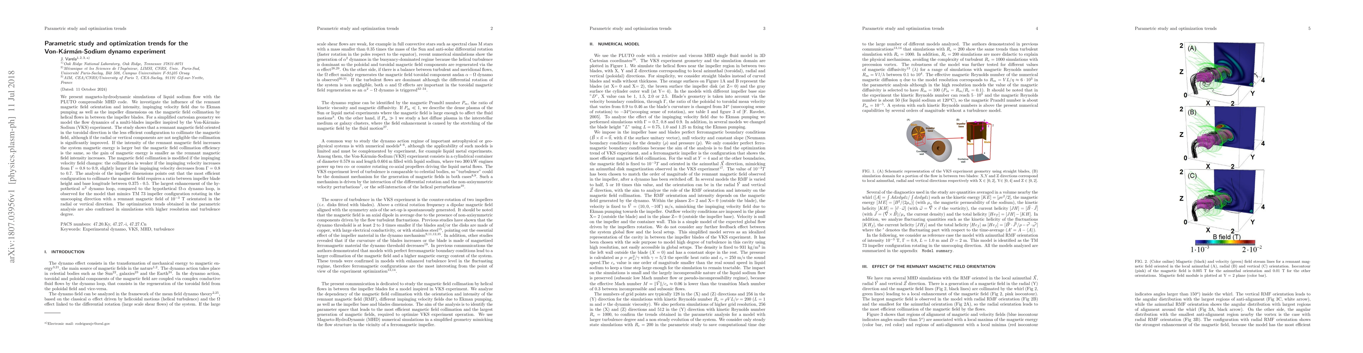 We present magneto-hydrodynamic simulations of liquid sodium flow with the PLUTO compressible MHD code. We investigate the influence of the remnant magnetic field orientation and intensity, impinging velocity field due to Ekman pumping as well as the impeller dimensions on the magnetic field collimation by helical flows in between the impeller blades. For a simplified cartesian geometry we model the flow dynamics of a multi-blades impeller inspired by the Von-Karman-Sodium (VKS) experiment. The study shows that a remnant magnetic field oriented in the toroidal direction is the less efficient configuration to collimate the magnetic field, although if the radial or vertical components are not negligible the collimation is significantly improved. If the intensity of the remnant magnetic field increases the system magnetic energy is larger but the magnetic field collimation efficiency is the same, so the gain of magnetic energy is smaller as the remnant magnetic field intensity increases. The magnetic field collimation is modified if the impinging velocity field changes: the collimation is weaker if the impinging velocity increases from Gamma=0.8 to 0.9, slightly larger if the impinging velocity decreases from Gamma=0.8 to 0.7. The analysis of the impeller dimensions points out that the most efficient configuration to collimate the magnetic field requires a ratio between impeller blade height and base longitude between 0.375 - 0.5. The largest enhancement of the hypothetical alpha^2 dynamo loop, compared to the hypothetical Omega-alpha dynamo loop, is observed for the model that mimics TM 73 impeller configuration rotating in the unscooping direction with a remnant magnetic field of 10^-3 T orientated in the radial or vertical direction. The optimization trends obtained in the parametric analysis are also confirmed in simulations with higher resolution and turbulence degree.
