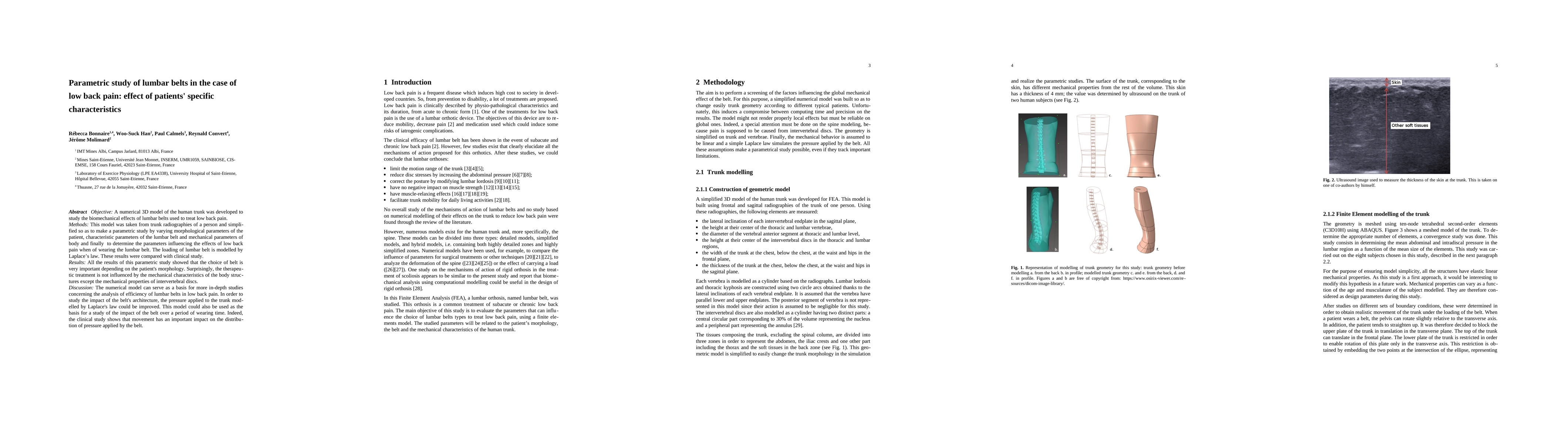 This study uses a 3D numerical model of the human trunk to investigate how lumbar belts affect low back pain, finding that patient morphology significantly influences the belt's effectiveness, while mechanical body properties, except for intervertebral discs, have minimal impact. The model suggests potential for further research into belt efficiency and long-term use.