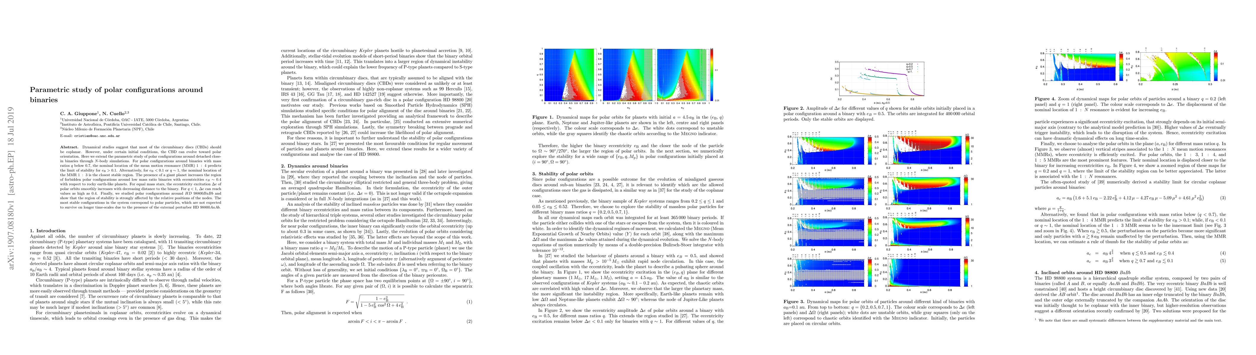 Dynamical studies suggest that most of the circumbinary discs (CBDs) should be coplanar. However, under certain initial conditions, the CBD can evolve toward polar orientation. Here we extend the parametric study of polar configurations around detached close-in binaries through $N$-body simulations. For polar configurations around binaries with mass ratios $q$ below $0.7$, the nominal location of the mean motion resonance (MMR) $1~:~4$ predicts the limit of stability for $e_{B} > 0.1$. Alternatively, for $e_{B} < 0.1$ or $q \sim 1$, the nominal location of the MMR $1~:~3$ is the closest stable region. The presence of a} giant planet increases the region of forbidden polar configurations around low mass ratio binaries with eccentricities $e_B\sim0.4$ with respect to rocky earth-like planets. For equal mass stars, the eccentricity excitation $\Delta e$ of polar orbits smoothly increases with decreasing distance to the binary. For $q<1$, $\Delta e$ can reach values as high as $0.4$. Finally, we studied polar configurations around $HD~98800BaBb$ and show that the region of stability is strongly affected by the relative positions of the nodes. The most stable configurations in the system correspond to polar particles, which are not expected to survive on longer time-scales due to the presence of the external perturber HD~$98800AaAb$.