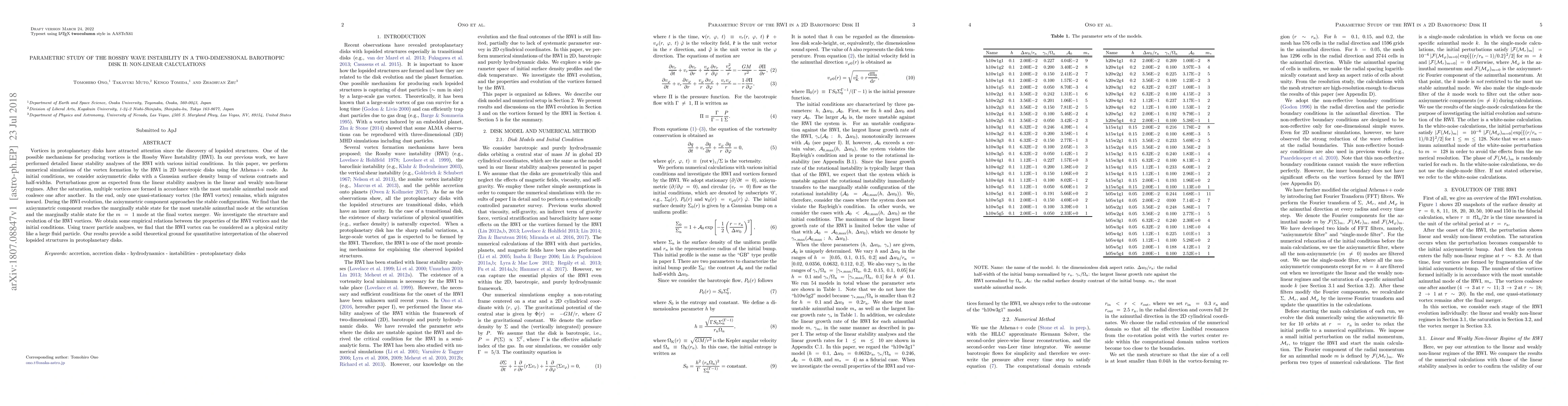This paper investigates the Rossby Wave Instability (RWI) in 2D barotropic disks using numerical simulations, finding that multiple vortices form and coalesce until a single quasi-stationary vortex remains, which migrates inward. The study provides empirical relations between vortex properties and initial conditions, offering a theoretical basis for understanding observed lopsided structures in protoplanetary disks.