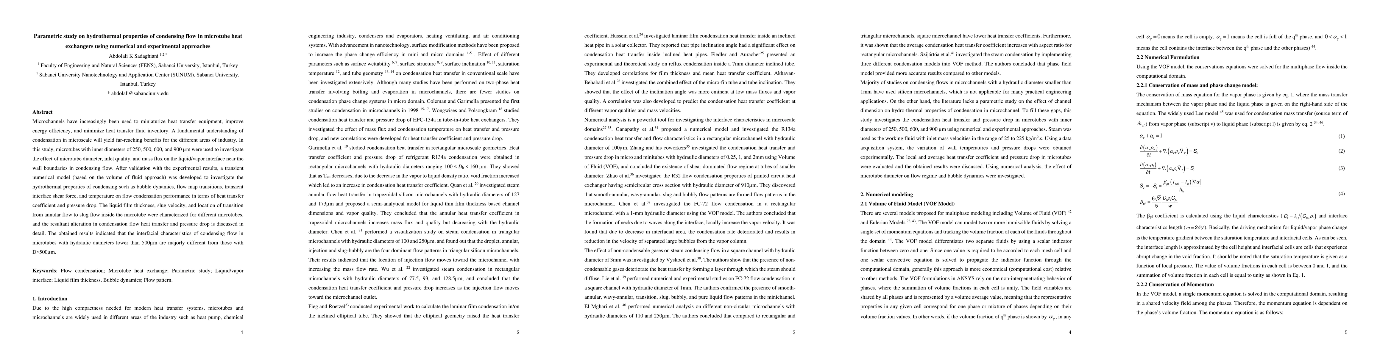Microchannels have increasingly been used to miniaturize heat transfer equipment, improve energy efficiency, and minimize heat transfer fluid inventory. A fundamental understanding of condensation in microscale will yield far-reaching benefits for the different areas of industry. In this study, microtubes with inner diameters of 250, 500, 600, and 900 um were used to investigate the effect of microtube diameter, inlet quality, and mass flux on the liquid/vapor interface near the wall boundaries in condensing flow. After validation with the experimental results, a transient numerical model (based on the volume of fluid approach) was developed to investigate the hydrothermal properties of condensing such as bubble dynamics, flow map transitions, transient interface shear force, and temperature on flow condensation performance in terms of heat transfer coefficient and pressure drop. The liquid film thickness, slug velocity, and location of transition from annular flow to slug flow inside the microtube were characterized for different microtubes, and the resultant alteration in condensation flow heat transfer and pressure drop is discussed in detail. The obtained results indicated that the interfacial characteristics of condensing flow in microtubes with hydraulic diameters lower than 500um are majorly different from those with D>500um.