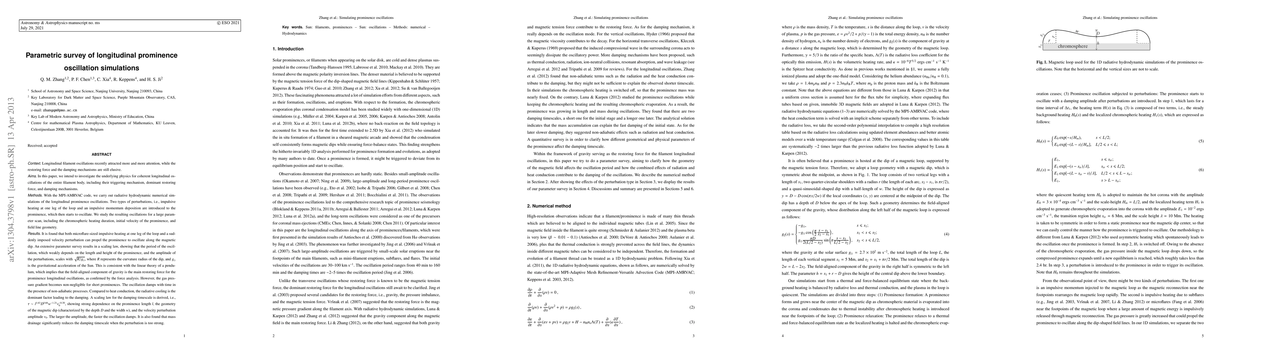 It is found that both microflare-sized impulsive heating at one leg of the loop and a suddenly imposed velocity perturbation can propel the prominence to oscillate along the magnetic dip. An extensive parameter survey results in a scaling law, showing that the period of the oscillation, which weakly depends on the length and height of the prominence, and the amplitude of the perturbations, scales with $\sqrt{R/g_\odot}$, where $R$ represents the curvature radius of the dip, and $g_\odot$ is the gravitational acceleration of the Sun. This is consistent with the linear theory of a pendulum, which implies that the field-aligned component of gravity is the main restoring force for the prominence longitudinal oscillations, as confirmed by the force analysis. However, the gas pressure gradient becomes non-negligible for short prominences. The oscillation damps with time in the presence of non-adiabatic processes. Compared to heat conduction, the radiative cooling is the dominant factor leading to the damping. A scaling law for the damping timescale is derived, i.e., $\tau\sim l^{1.63} D^{0.66}w^{-1.21}v_{0}^{-0.30}$, showing strong dependence on the prominence length $l$, the geometry of the magnetic dip (characterized by the depth $D$ and the width $w$), and the velocity perturbation amplitude $v_0$. The larger the amplitude, the faster the oscillation damps. It is also found that mass drainage significantly reduces the damping timescale when the perturbation is too strong.