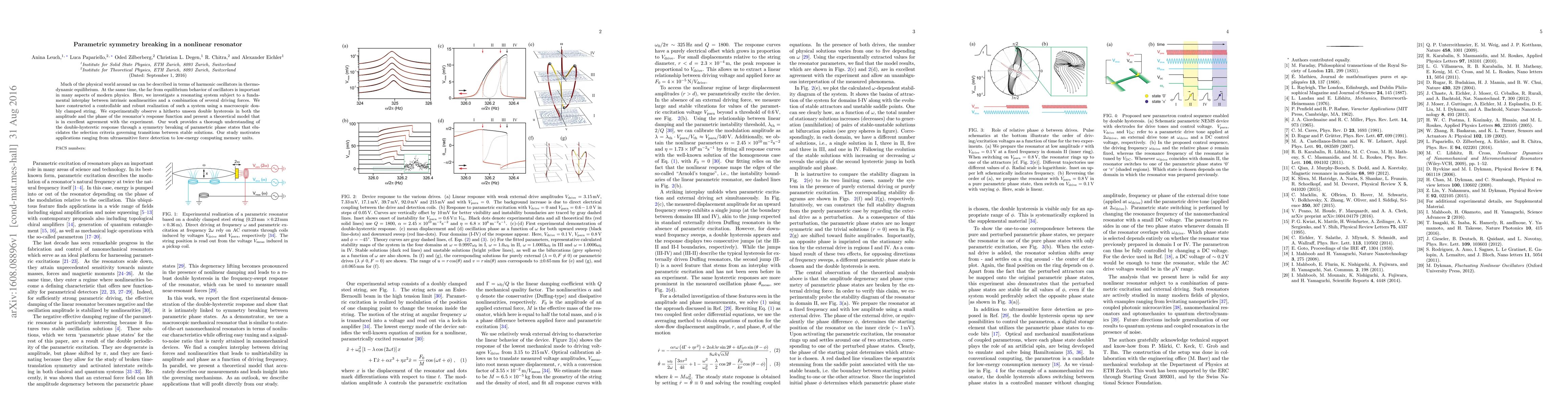 This paper investigates a nonlinear resonator subjected to multiple driving forces, revealing a novel double hysteresis in amplitude and phase response. The study combines experimental observations with a theoretical model to understand parametric symmetry breaking, with potential applications in force detection and low-energy computing.