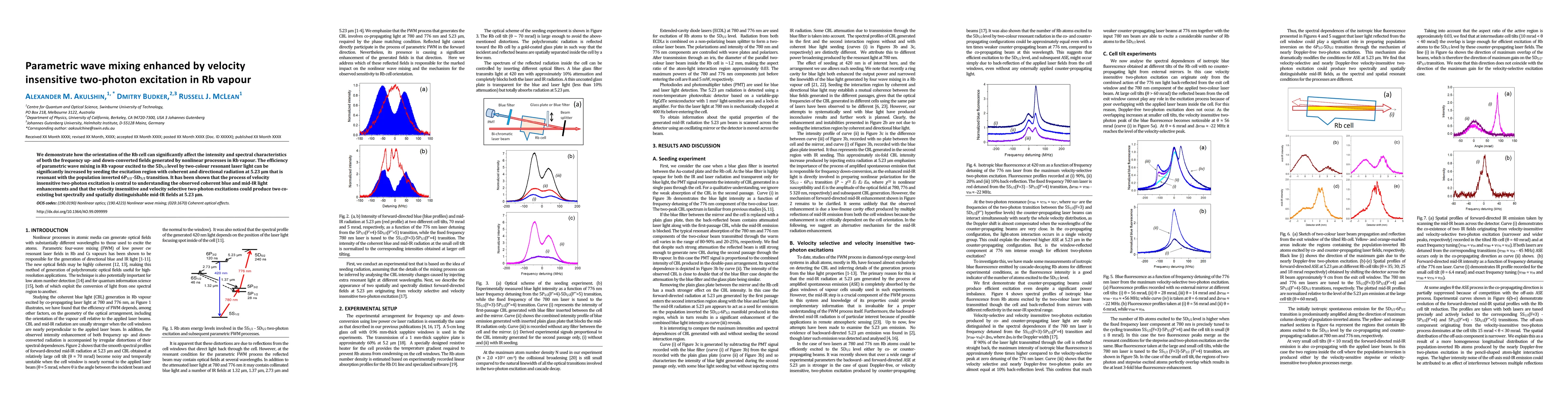 This paper demonstrates how the orientation of Rb cells influences parametric wave mixing efficiency, achieving enhanced frequency conversion through two-photon excitation at 5.23 um. The study reveals that velocity insensitive two-photon excitation plays a crucial role in generating coherent blue and mid-IR light fields.
