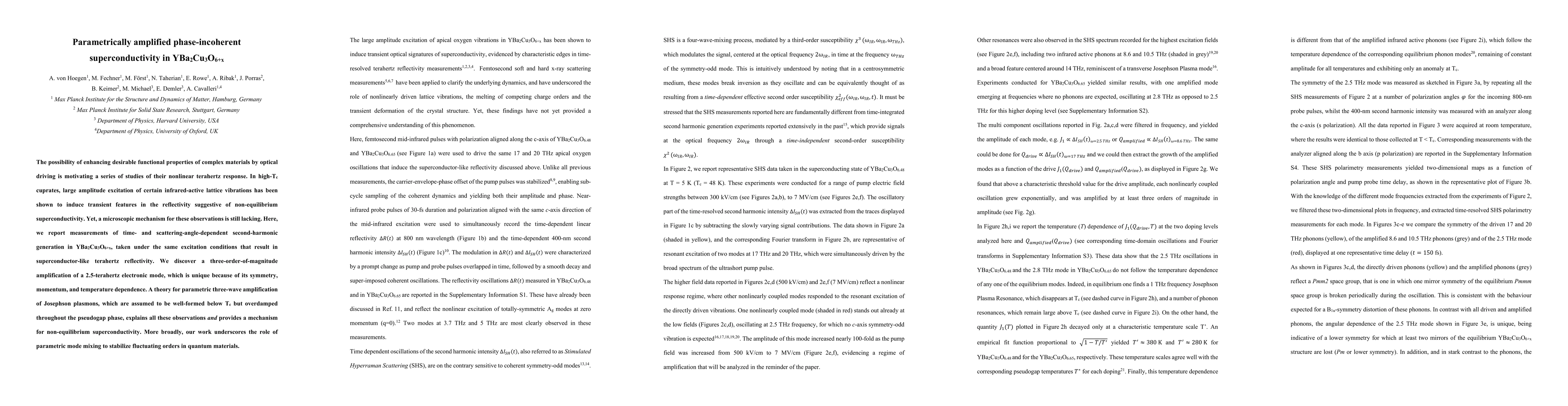 The possibility of enhancing desirable functional properties of complex materials by optical driving is motivating a series of studies of their nonlinear terahertz response. In high-Tc cuprates, large amplitude excitation of certain infrared-active lattice vibrations has been shown to induce transient features in the reflectivity suggestive of non-equilibrium superconductivity. Yet, a microscopic mechanism for these observations is still lacking. Here, we report measurements of time- and scattering-angle-dependent second-harmonic generation in YBa$_2$Cu$_3$O$_{6+x}$, taken under the same excitation conditions that result in superconductor-like terahertz reflectivity. We discover a three-order-of-magnitude amplification of a 2.5-terahertz electronic mode, which is unique because of its symmetry, momentum, and temperature dependence. A theory for parametric three-wave amplification of Josephson plasmons, which are assumed to be well-formed below T$_c$ but overdamped throughout the pseudogap phase, explains all these observations and provides a mechanism for non-equilibrium superconductivity. More broadly, our work underscores the role of parametric mode mixing to stabilize fluctuating orders in quantum materials.