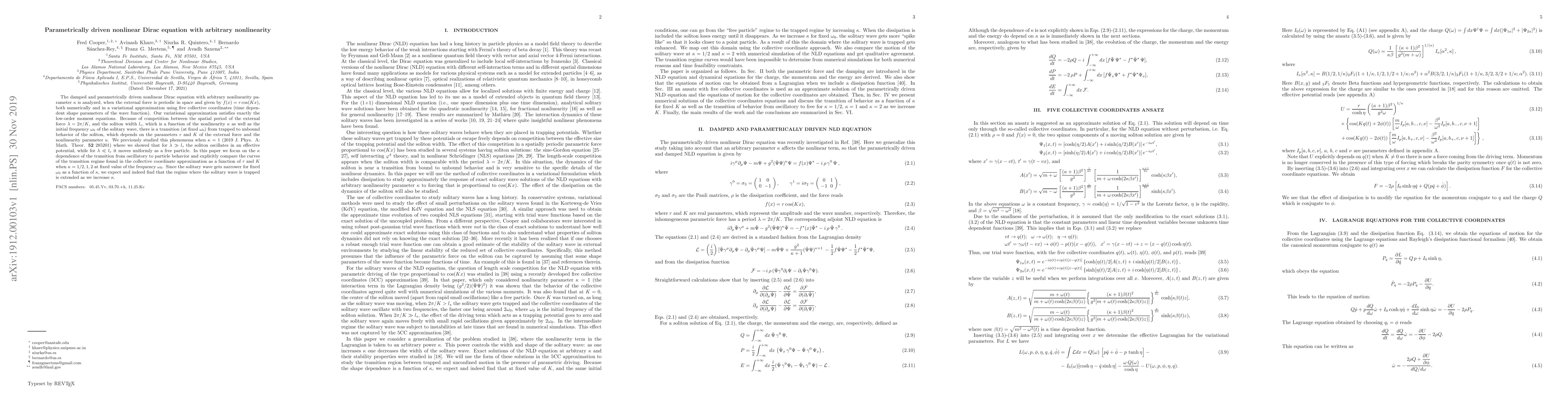 This paper analyzes the damped and parametrically driven nonlinear Dirac equation with arbitrary nonlinearity, focusing on the transition between trapped and unbound soliton behavior. The study compares the $\kappa$ dependence of this transition using a variational approximation with five collective coordinates.