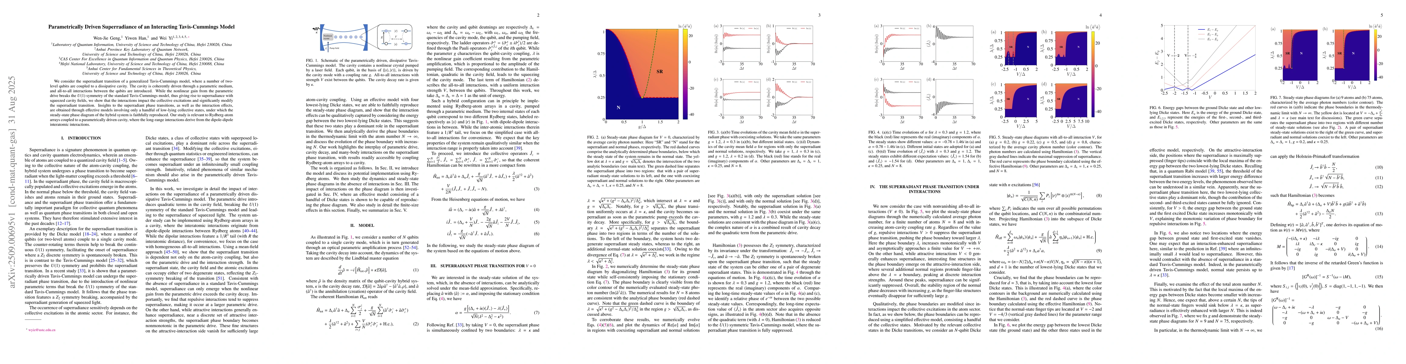 We consider the superradiant transition of a generalized Tavis-Cummings model, where a number of two-level qubits are coupled to a dissipative cavity. The cavity is coherently driven through a parametric medium, and all-to-all interactions between the qubits are introduced. While the nonlinear gain from the parametric drive breaks the U(1) symmetry of the standard Tavis-Cummings model, thus giving rise to superradiance with squeezed cavity fields, we show that the interactions impact the collective excitations and significantly modify the superradiant transition. Insights to the superradiant phase transitions, as well as the interaction effects, are obtained through effective models involving only a handful of low-lying collective states, under which the steady-state phase diagram of the hybrid system is faithfully reproduced. Our study is relevant to Rydberg-atom arrays coupled to a parametrically driven cavity, where the long-range interactions derive from the dipole-dipole interatomic interactions.
