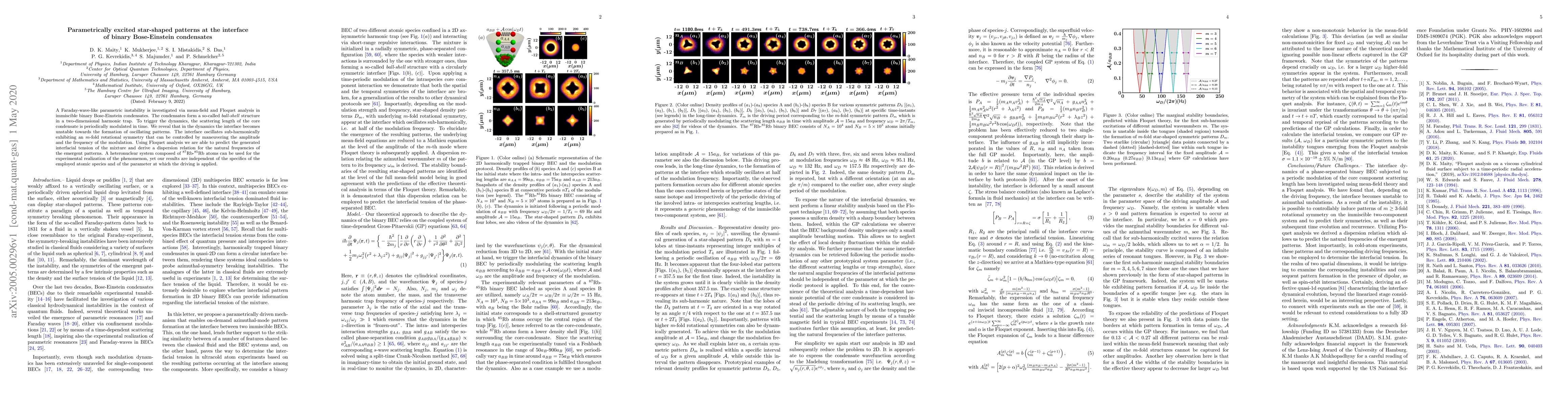 A Faraday-wave-like parametric instability is investigated via mean-field and Floquet analysis in immiscible binary Bose-Einstein condensates. The condensates form a so-called \textit{ball-shell} structure in a two-dimensional harmonic trap. To trigger the dynamics, the scattering length of the core condensate is periodically modulated in time. We reveal that in the dynamics the interface becomes unstable towards the formation of oscillating patterns. The interface oscillates sub-harmonically exhibiting an $m$-fold rotational symmetry that can be controlled by maneuvering the amplitude and the frequency of the modulation. Using Floquet analysis we are able to predict the generated interfacial tension of the mixture and derive a dispersion relation for the natural frequencies of the emergent patterns. A heteronuclear system composed of $^{87}$Rb-$^{85}$Rb atoms can be used for the experimental realization of the phenomenon, yet our results are independent of the specifics of the employed atomic species {and of the parameter at which the driving is applied.