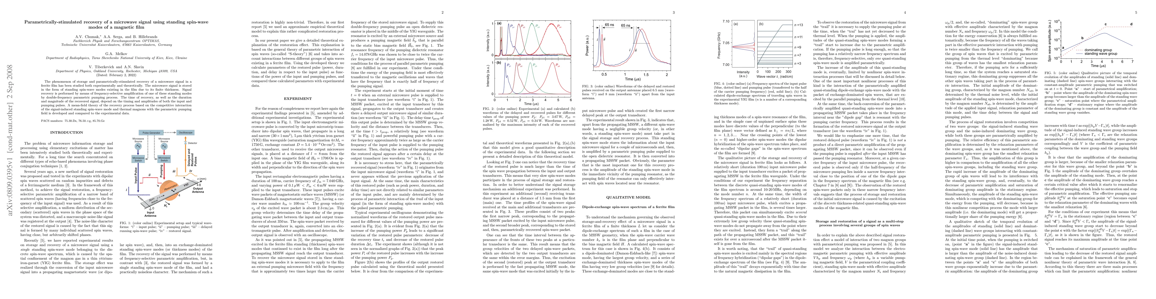 The phenomenon of storage and parametrically-stimulated recovery of a microwave signal in a ferrite film has been studied both experimentally and theoretically. The microwave signal is stored in the form of standing spin-wave modes existing in the film due to its finite thickness. Signal recovery is performed by means of frequency-selective amplification of one of these standing modes by double- requency parametric pumping process. The time of recovery, as well as the duration and magnitude of the recovered signal, depend on the timing and amplitudes of both the input and pumping pulses. A mean-field theory of the recovery process based on the competitive interaction of the signal-induced standing spin-wave mode and thermal magnons with the parametric pumping field is developed and compared to the experimental data.