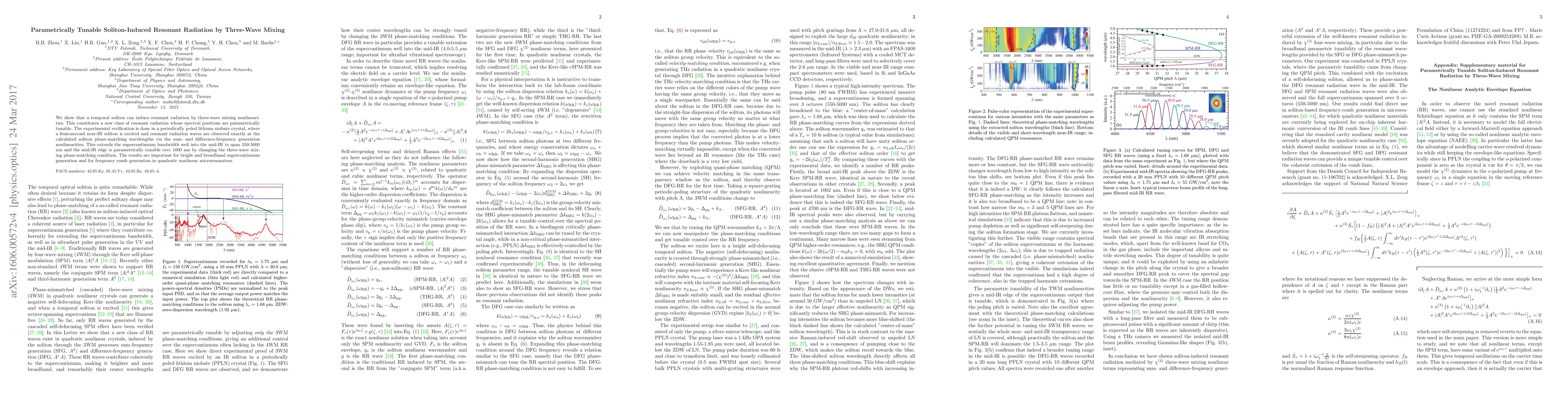 This paper demonstrates a temporal soliton inducing resonant radiation via three-wave mixing, enabling parametrically tunable spectral positions. Experimentally verified in a periodically poled lithium niobate crystal, it extends the supercontinuum bandwidth into the mid-IR and allows tuning the mid-IR edge by adjusting phase-matching conditions.