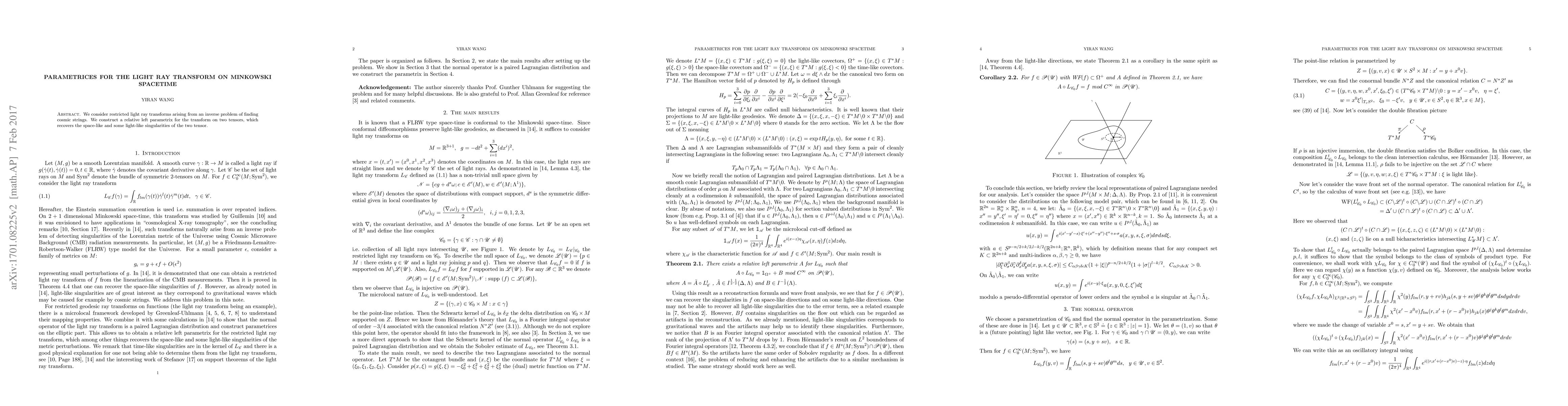 We consider restricted light ray transforms arising from an inverse problem of finding cosmic strings. We construct a relative left parametrix for the transform on two tensors, which recovers the space-like and some light-like singularities of the two tensor.