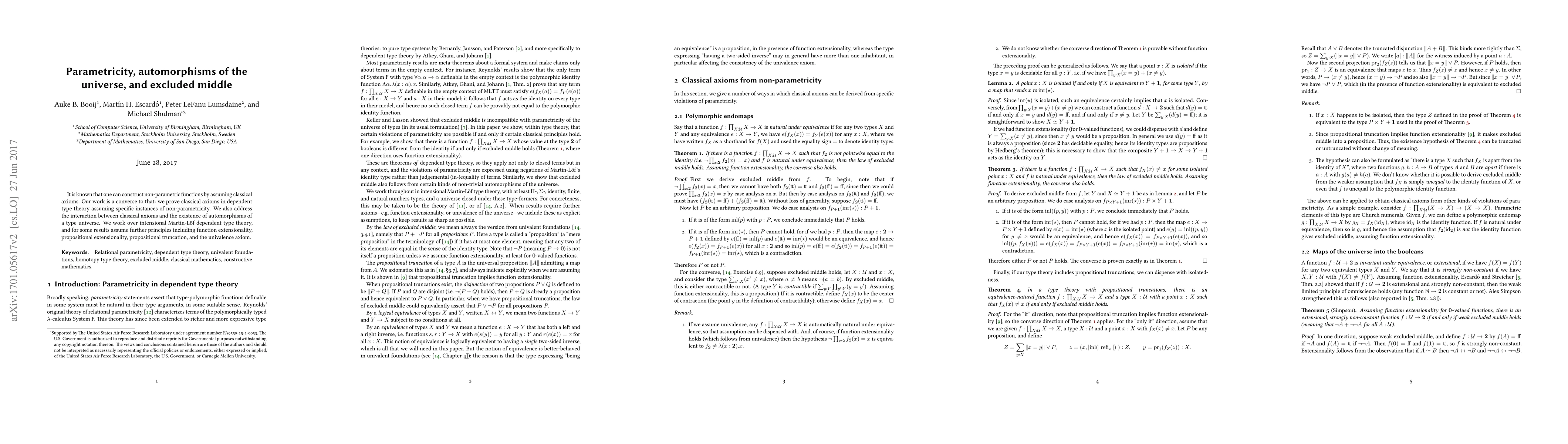 This paper proves classical axioms in dependent type theory under assumptions of non-parametricity, exploring the interplay between these axioms and automorphisms of a type universe. It leverages intensional Martin-Löf theory and additional principles like function and propositional extensionality.