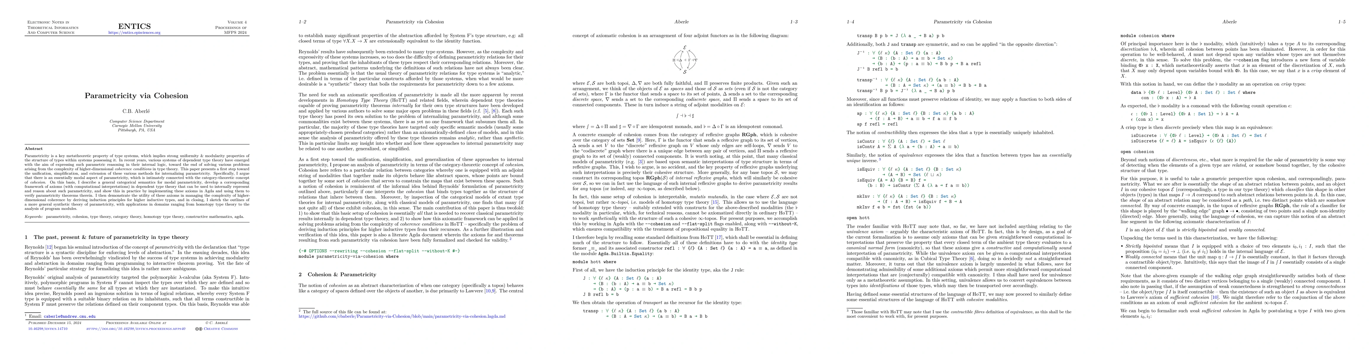 This paper introduces a novel categorical semantics for parametricity based on the concept of cohesion, proposing a framework for internalizing and reasoning about parametricity in dependent type theory. It demonstrates practical applications in simplifying higher-dimensional coherence conditions and managing complexity in type theory, with implementations in Agda.