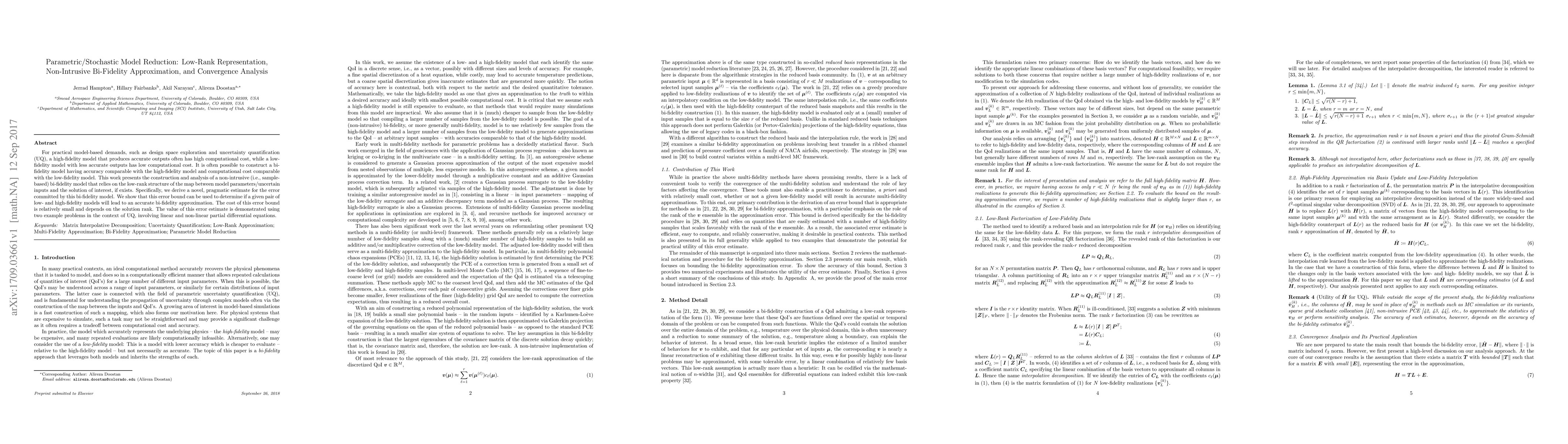 For practical model-based demands, such as design space exploration and uncertainty quantification (UQ), a high-fidelity model that produces accurate outputs often has high computational cost, while a low-fidelity model with less accurate outputs has low computational cost. It is often possible to construct a bi-fidelity model having accuracy comparable with the high-fidelity model and computational cost comparable with the low-fidelity model. This work presents the construction and analysis of a non-intrusive (i.e., sample-based) bi-fidelity model that relies on the low-rank structure of the map between model parameters/uncertain inputs and the solution of interest, if exists. Specifically, we derive a novel, pragmatic estimate for the error committed by this bi-fidelity model. We show that this error bound can be used to determine if a given pair of low- and high-fidelity models will lead to an accurate bi-fidelity approximation. The cost of this error bound is relatively small and depends on the solution rank. The value of this error estimate is demonstrated using two example problems in the context of UQ, involving linear and non-linear partial differential equations.