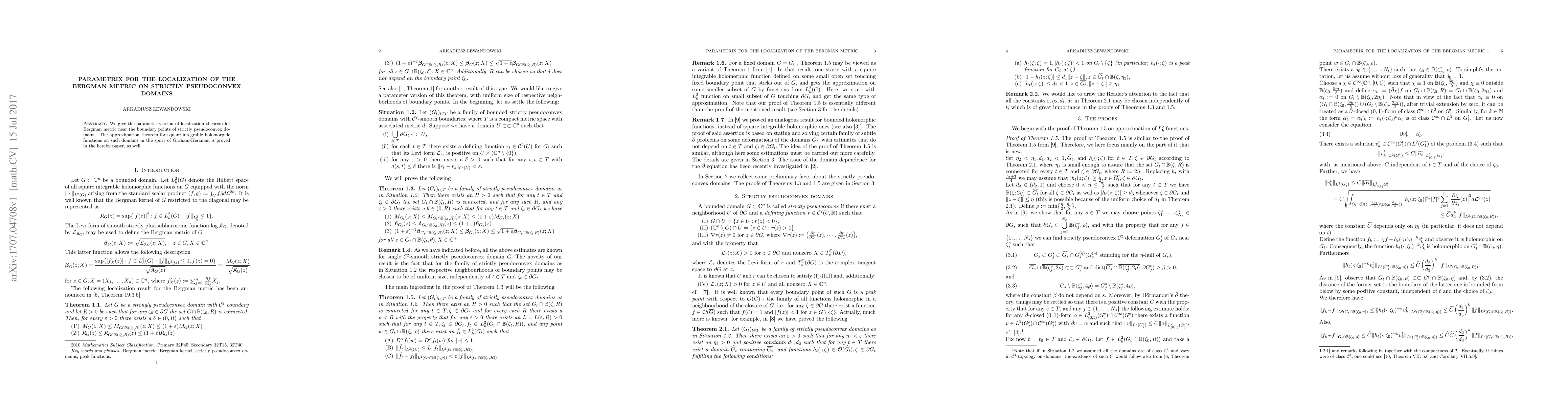 Summary: This paper presents a parameter localization theorem for the Bergman metric near boundary points of strictly pseudoconvex domains, and proves an approximation theorem for square integrable holomorphic functions in the spirit of Graham-Kerzman.