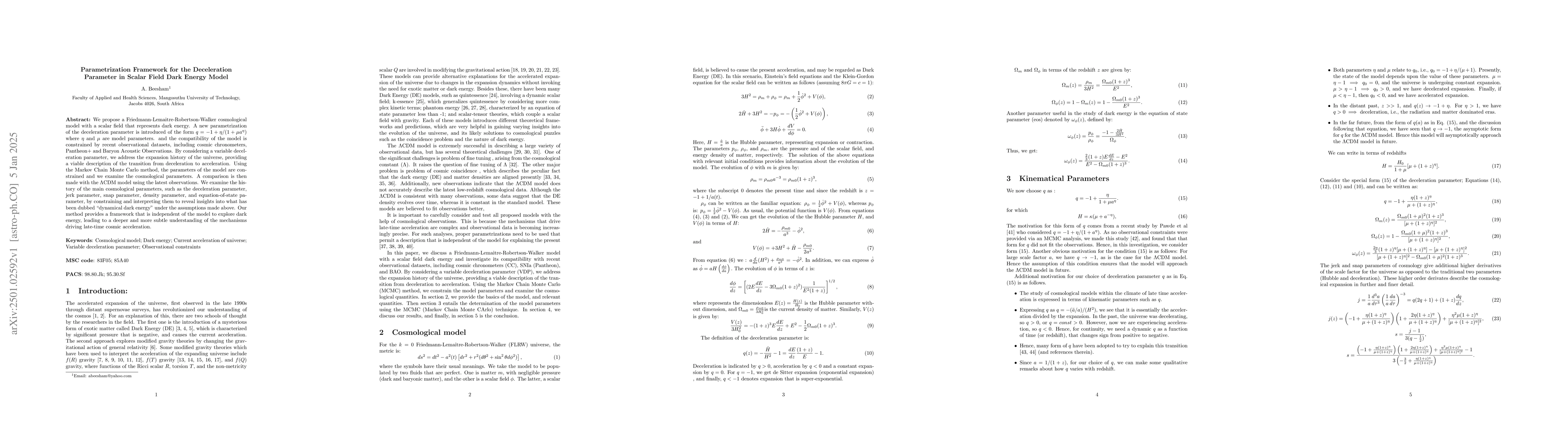 We propose a Friedmann-Lemaitre-Robertson-Walker cosmological model with a scalar field that represents dark energy. A new parametrization of the deceleration parameter is introduced of the form $q = 1 + \eta (1 + \mu a^{\eta})$ where $\eta$ and $\mu$ are model parameters. and the compatibility of the model is constrained by recent observational datasets, including cosmic chronometers, Pantheon+ and Baryon Acoustic Observations. By considering a variable deceleration parameter, we address the expansion history of the universe, providing a viable description of the transition from deceleration to acceleration. Using the Markov Chain Monte Carlo method, the parameters of the model are constrained and we examine the cosmological parameters. A comparison is then made with the $\Lambda$CDM model using the latest observations. We examine the history of the main cosmological parameters, such as the deceleration parameter, jerk parameter, snap parameter, density parameter, and equation-of-state parameter, by constraining and interpreting them to reveal insights into what has been dubbed "dynamical dark energy" under the assumptions made above. Our method provides a framework that is independent of the model to explore dark energy, leading to a deeper and more subtle understanding of the mechanisms driving late-time cosmic acceleration.