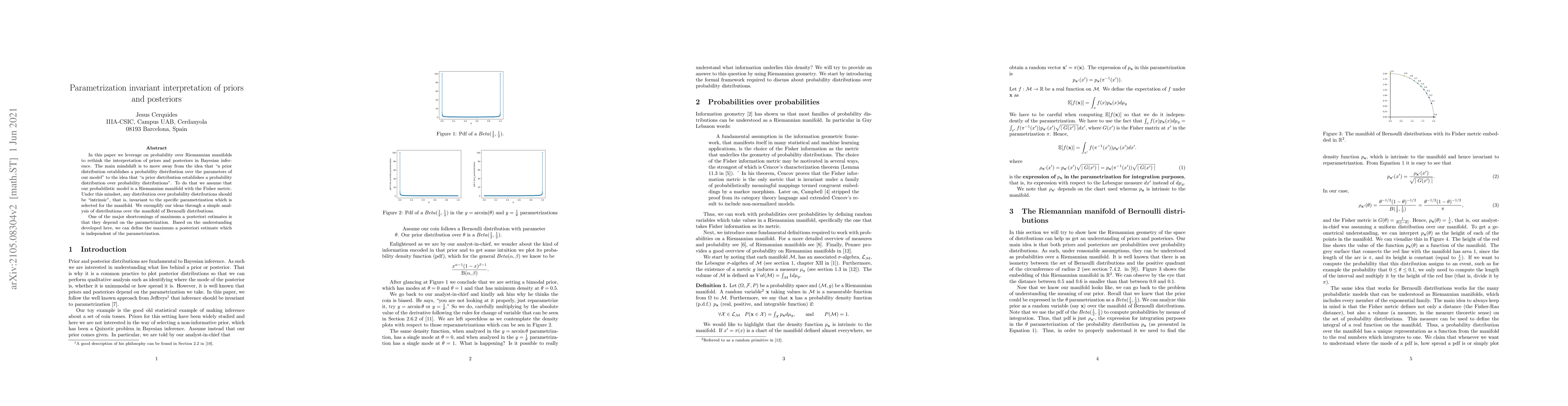 In this paper we leverage on probability over Riemannian manifolds to rethink the interpretation of priors and posteriors in Bayesian inference. The main mindshift is to move away from the idea that "a prior distribution establishes a probability distribution over the parameters of our model" to the idea that "a prior distribution establishes a probability distribution over probability distributions". To do that we assume that our probabilistic model is a Riemannian manifold with the Fisher metric. Under this mindset, any distribution over probability distributions should be "intrinsic", that is, invariant to the specific parametrization which is selected for the manifold. We exemplify our ideas through a simple analysis of distributions over the manifold of Bernoulli distributions. One of the major shortcomings of maximum a posteriori estimates is that they depend on the parametrization. Based on the understanding developed here, we can define the maximum a posteriori estimate which is independent of the parametrization.