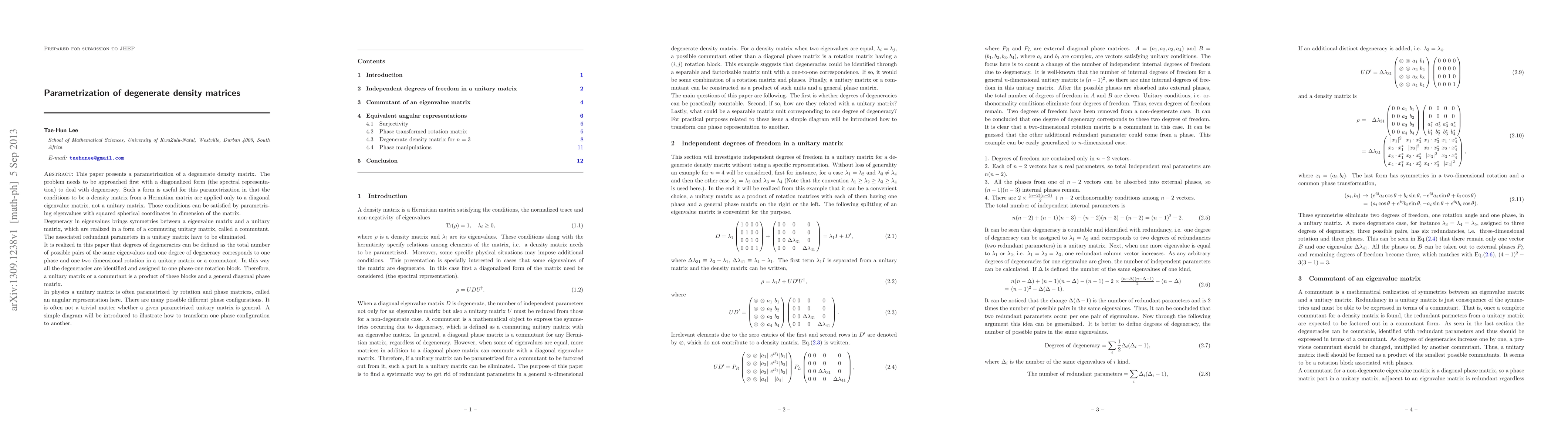 This paper introduces a parametrization method for degenerate density matrices by first diagonalizing them, then applying squared spherical coordinates to the eigenvalues. It identifies degeneracies through commuting unitary matrices and simplifies the representation by reducing redundant parameters, ultimately expressing the unitary matrix as a product of phase and rotation blocks.