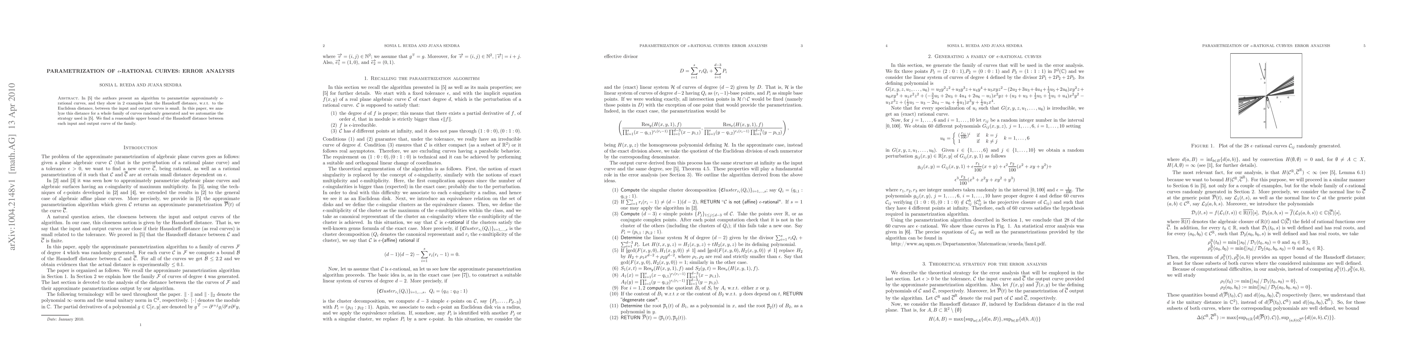 In [Computer Aided Geometric Design 27 (2010), 212-231] the authors present an algorithm to parametrize approximately $\epsilon$-rational curves, and they show in 2 examples that the Hausdorff distance, w.r.t. to the Euclidean distance, between the input and output curves is small. In this paper, we analyze this distance for a whole family of curves randomly generated and we automatize the strategy used in [Computer Aided Geometric Design 27 (2010), 212-231]. We find a reasonable upper bound of the Hausdorff distance between each input and output curve of the family.