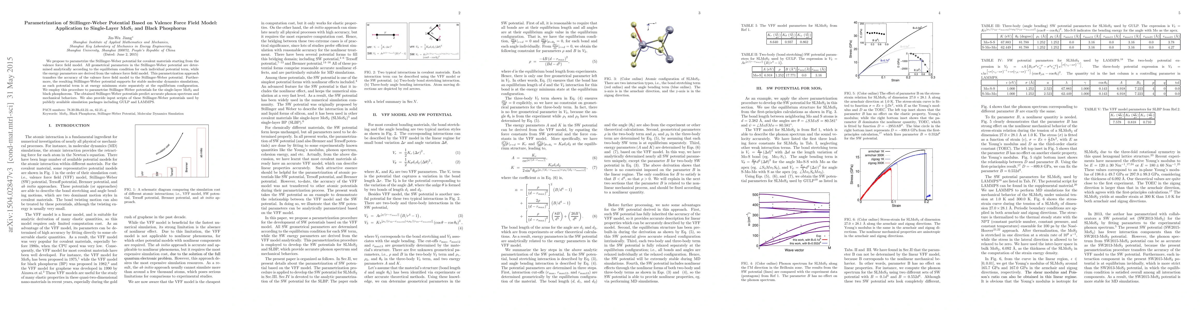This paper proposes a new method to parametrize the Stillinger-Weber potential for covalent materials using the valence force field model, which accurately predicts phonon spectra and mechanical behaviors in single-layer MoS2 and black phosphorus. The method ensures each potential term is at an energy minimum state.