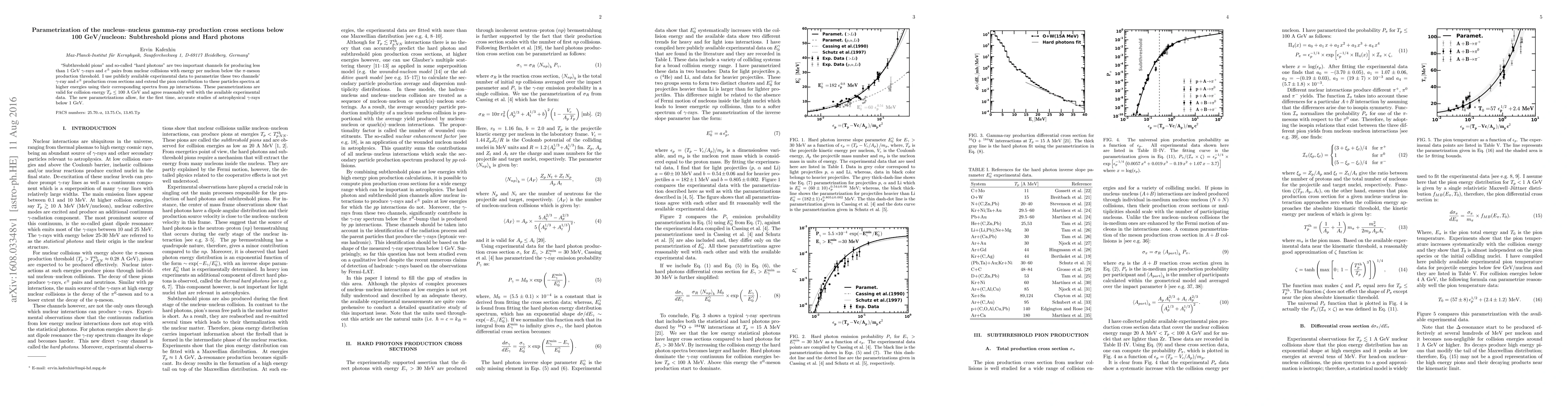 "Subthreshold pions" and so-called "hard photons" are two important channels for producing less than 1 GeV $\gamma$-rays and $e^\pm$ pairs from nuclear collisions with energy per nucleon below the $\pi$-meson production threshold. I use publicly available experimental data to parametrize these two channels' $\gamma$-ray and $e^\pm$ production cross sections and extend the pion contribution to these particles spectra at higher energies using their corresponding spectra from $pp$ interactions. These parametrizations are valid for collision energy $T_p\leq 100$ A GeV and agree reasonably well with the available experimental data. The new parametrizations allow, for the first time, accurate studies of astrophysical $\gamma$-rays below 1 GeV.