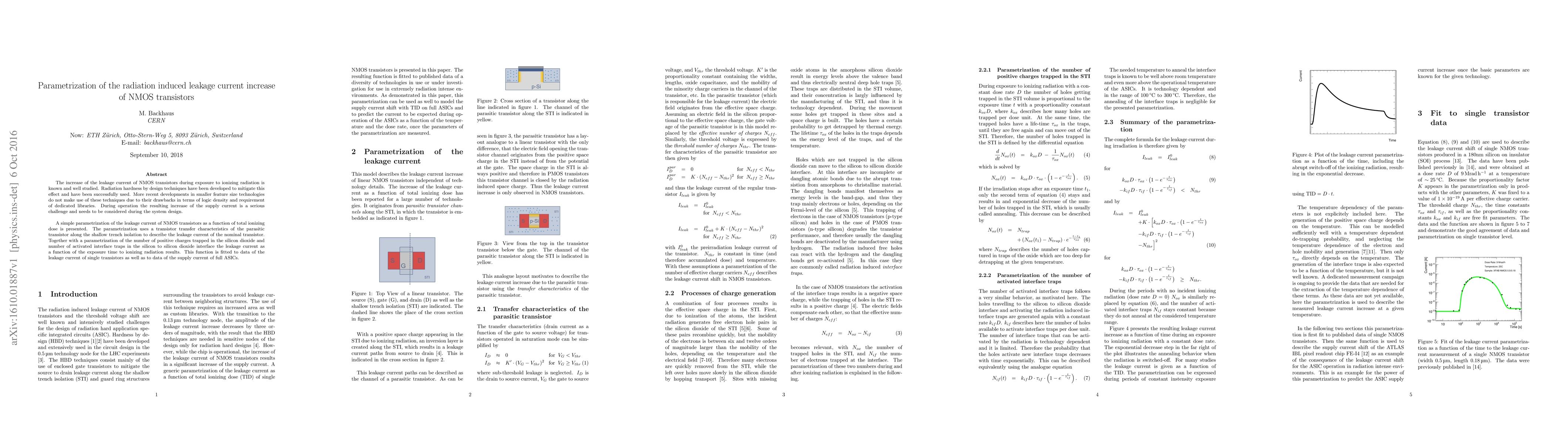 This paper presents a simple parametrization of the leakage current increase in NMOS transistors due to ionizing radiation, focusing on the impact of total dose exposure. The model incorporates the parasitic transistor's transfer characteristics and the number of trapped charges and interface traps, validated against both single transistor and full ASIC supply current data.