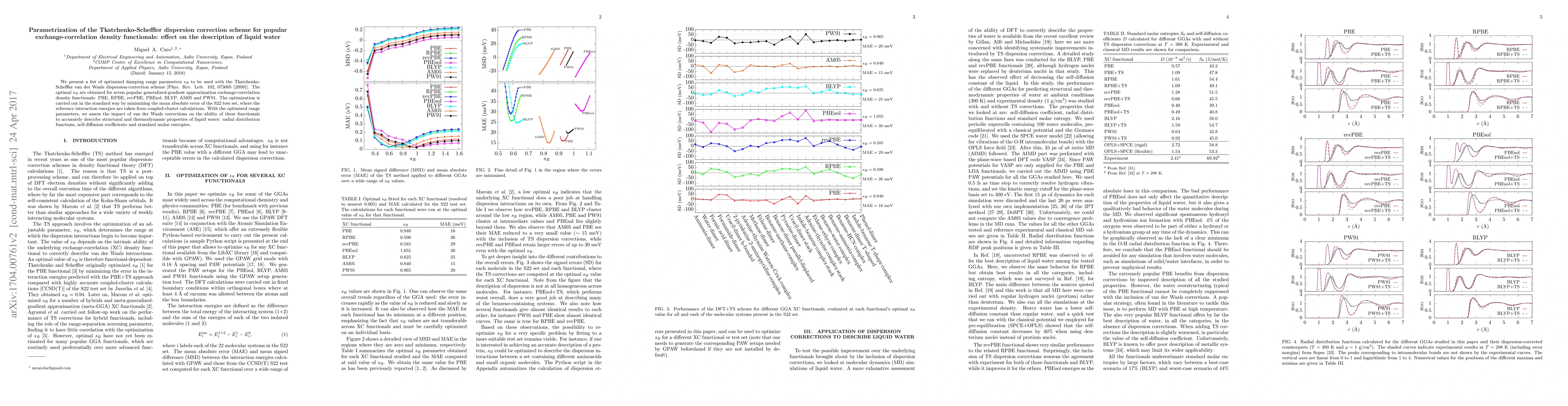 This paper optimizes damping range parameters for the Tkatchenko-Scheffler dispersion correction scheme for seven popular GGA functionals, assessing their impact on describing liquid water's structural and thermodynamic properties. The optimized parameters improve the accuracy of functionals in predicting liquid water's radial distribution functions, self-diffusion coefficients, and standard molar entropies.