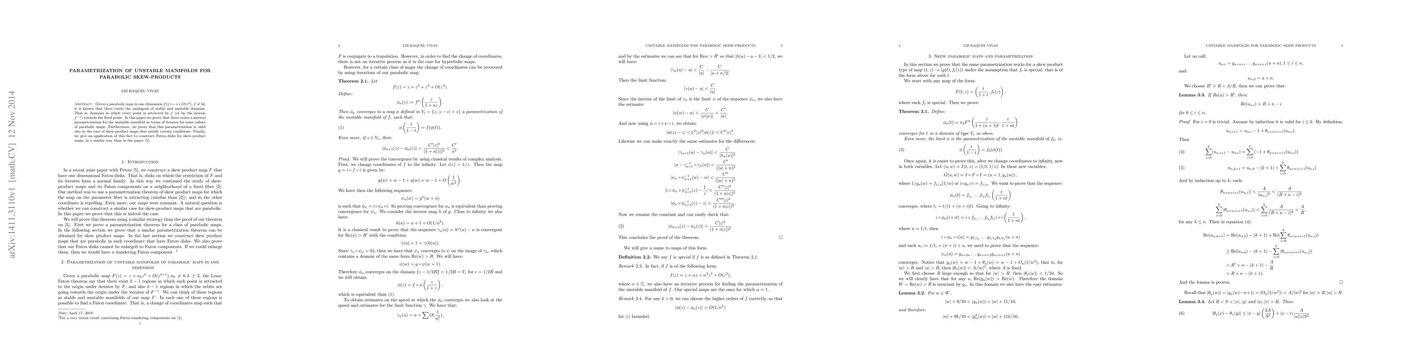 Given a parabolic map in one dimension $f(z) = z+O(z^2)$, $f \neq Id$, it is known that there exists the analogous of stable and unstable domains. That is, domains in which every point is attracted by $f$ (and by the inverse $f^{-1}$) towards the fixed point. In this paper we prove that there exists a natural parametrization for the unstable manifold in terms of iterates for some subset of parabolic maps. Furthermore, we prove that this parametrization is valid also in the case of skew-product maps that satisfy certain conditions. Finally, we give an application of this fact to construct Fatou disks for skew-product maps that are parabolic in each direction.