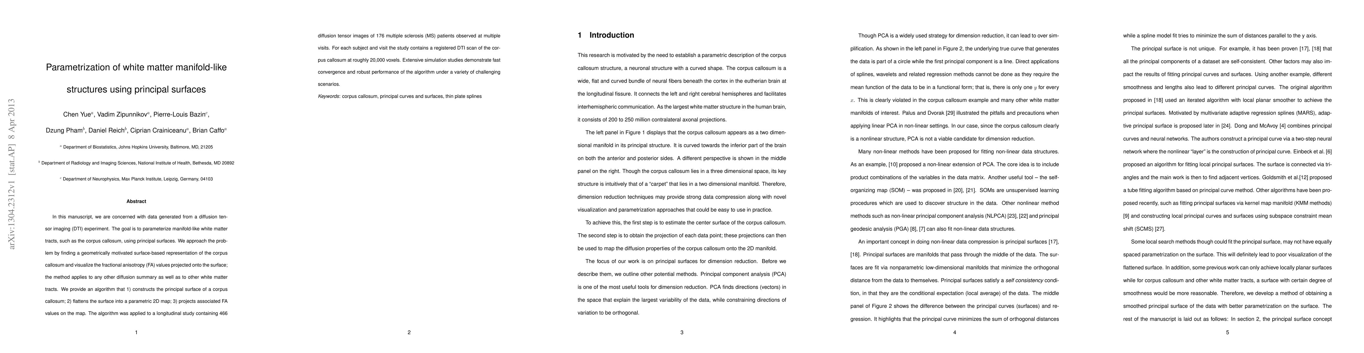 In this manuscript, we are concerned with data generated from a diffusion tensor imaging (DTI) experiment. The goal is to parameterize manifold-like white matter tracts, such as the corpus callosum, using principal surfaces. We approach the problem by finding a geometrically motivated surface-based representation of the corpus callosum and visualize the fractional anisotropy (FA) values projected onto the surface; the method applies to any other diffusion summary as well as to other white matter tracts. We provide an algorithm that 1) constructs the principal surface of a corpus callosum; 2) flattens the surface into a parametric 2D map; 3) projects associated FA values on the map. The algorithm was applied to a longitudinal study containing 466 diffusion tensor images of 176 multiple sclerosis (MS) patients observed at multiple visits. For each subject and visit the study contains a registered DTI scan of the corpus callosum at roughly 20,000 voxels. Extensive simulation studies demonstrate fast convergence and robust performance of the algorithm under a variety of challenging scenarios.