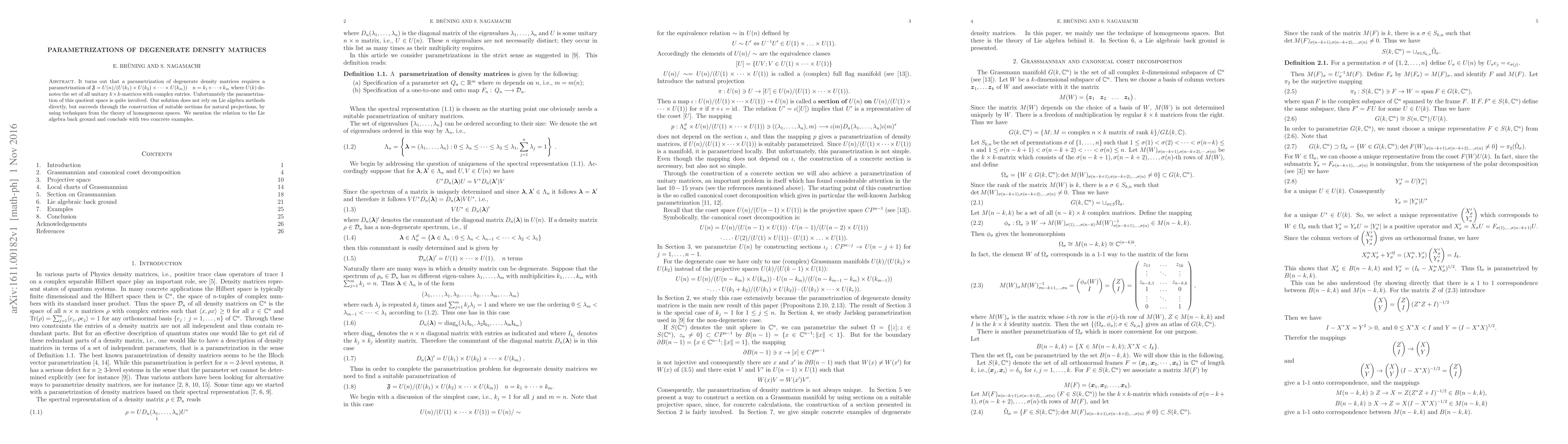 It turns out that a parametrization of degenerate density matrices requires a parametrization of $\mathfrak{F}=U(n)/({U(k_1)\times U(k_2)\times \cdots \times U(k_m)})\quad n=k_1 +\cdots + k_m $ where $U(k)$ denotes the set of all unitary $k\times k$-matrices with complex entries. Unfortunately the parametrization of this quotient space is quite involved. Our solution does not rely on Lie algebra methods {directly,} but succeeds through the construction of suitable sections for natural projections, by using techniques from the theory of homogeneous spaces. We mention the relation to the Lie algebra back ground and conclude with two concrete examples.