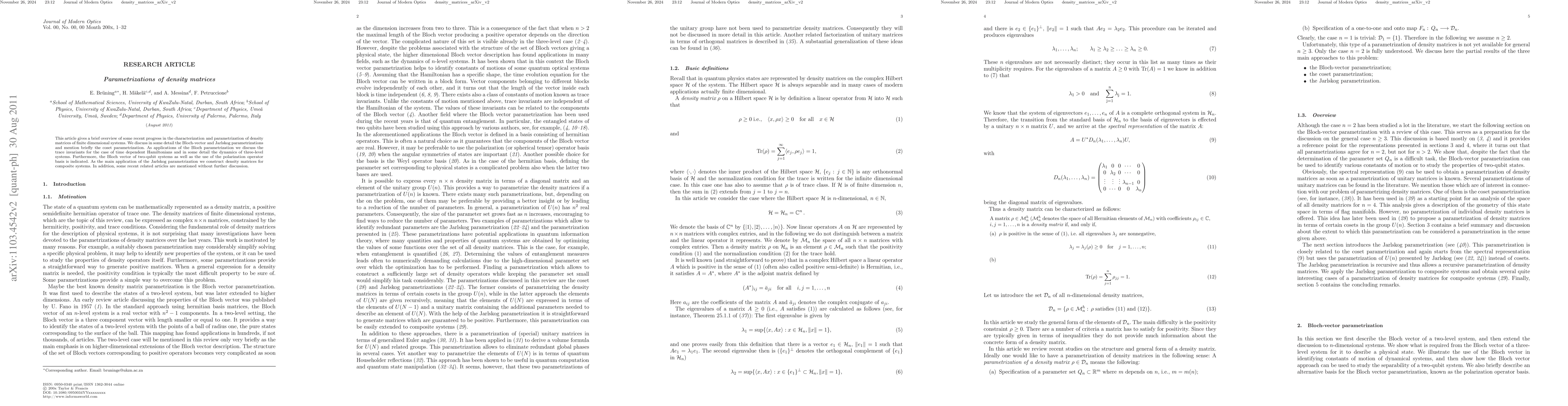 This paper reviews recent advancements in the parametrization of density matrices, focusing on the Bloch-vector and Jarlskog parametrizations, and briefly mentioning coset parametrization. It applies the Bloch parametrization to trace invariants and three-level system dynamics, and uses the Jarlskog parametrization to construct density matrices for composite systems.