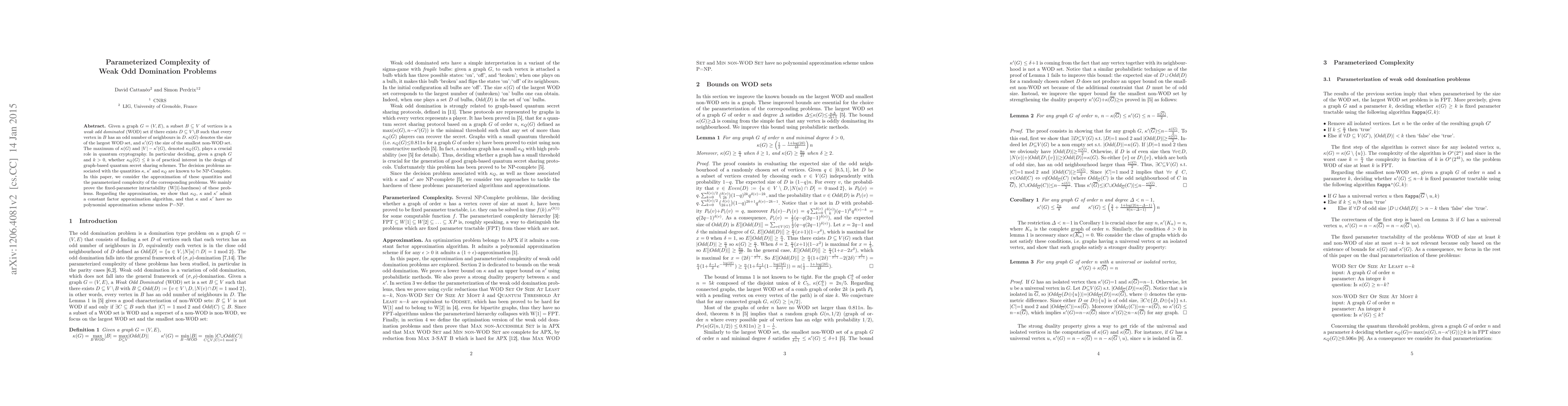Given a graph $G=(V,E)$, a subset $B\subseteq V$ of vertices is a weak odd dominated (WOD) set if there exists $D \subseteq V {\setminus} B$ such that every vertex in $B$ has an odd number of neighbours in $D$. $\kappa(G)$ denotes the size of the largest WOD set, and $\kappa'(G)$ the size of the smallest non-WOD set. The maximum of $\kappa(G)$ and $|V|-\kappa'(G)$, denoted $\kappa_Q(G)$, plays a crucial role in quantum cryptography. In particular deciding, given a graph $G$ and $k>0$, whether $\kappa_Q(G)\le k$ is of practical interest in the design of graph-based quantum secret sharing schemes. The decision problems associated with the quantities $\kappa$, $\kappa'$ and $\kappa_Q$ are known to be NP-Complete. In this paper, we consider the approximation of these quantities and the parameterized complexity of the corresponding problems. We mainly prove the fixed-parameter intractability (W$[1]$-hardness) of these problems. Regarding the approximation, we show that $\kappa_Q$, $\kappa$ and $\kappa'$ admit a constant factor approximation algorithm, and that $\kappa$ and $\kappa'$ have no polynomial approximation scheme unless P=NP.