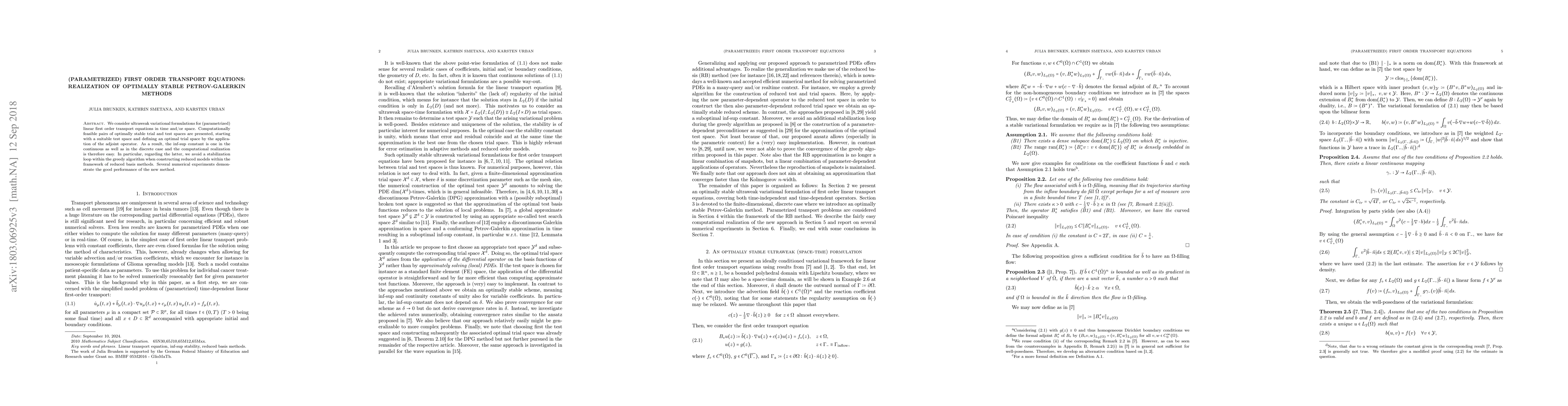 We consider ultraweak variational formulations for (parametrized) linear first order transport equations in time and/or space. Computationally feasible pairs of optimally stable trial and test spaces are presented, starting with a suitable test space and defining an optimal trial space by the application of the adjoint operator. As a result, the inf-sup constant is one in the continuous as well as in the discrete case and the computational realization is therefore easy. In particular, regarding the latter, we avoid a stabilization loop within the greedy algorithm when constructing reduced models within the framework of reduced basis methods. Several numerical experiments demonstrate the good performance of the new method.