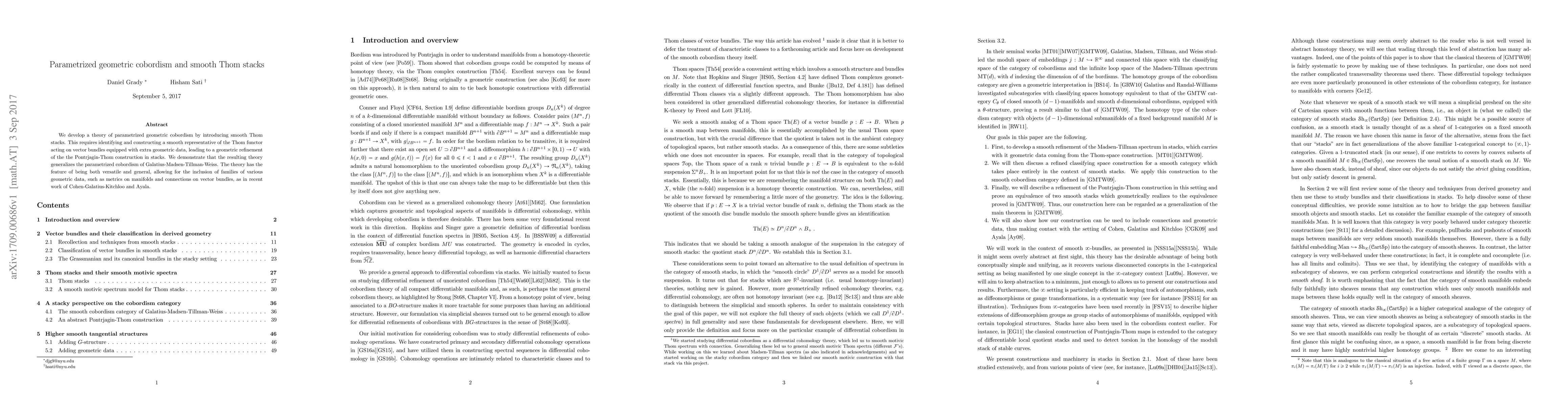 This paper develops a theory of parametrized geometric cobordism using smooth Thom stacks, refining the Pontrjagin-Thom construction in stacks and generalizing existing parametrized cobordism theories. The approach allows for the inclusion of diverse geometric data, such as metrics and connections.