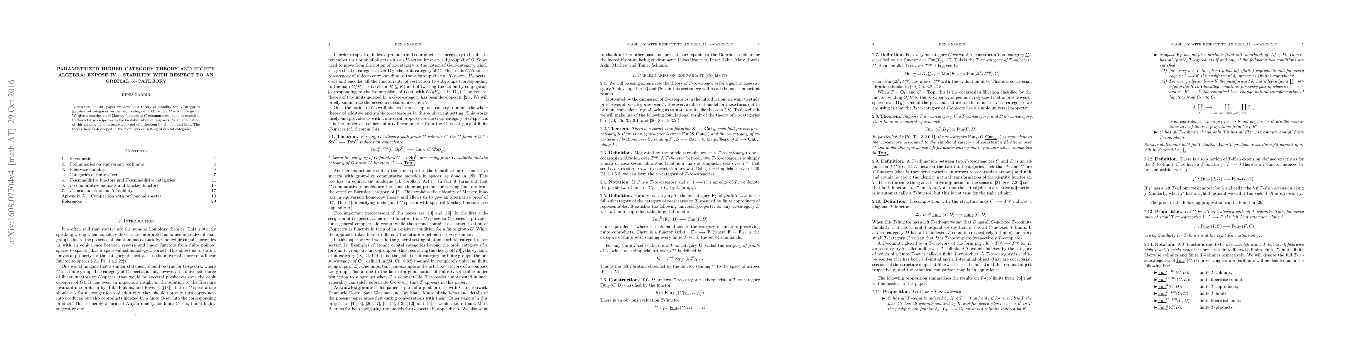 This paper develops a stability theory for $G$-categories using orbital $\infty$-categories, describing Mackey functors as $G$-commutative monoids and characterizing $G$-spectra as $G$-stabilization of $G$-spaces. It also offers an alternative proof of a theorem by Guillou and May within this framework.