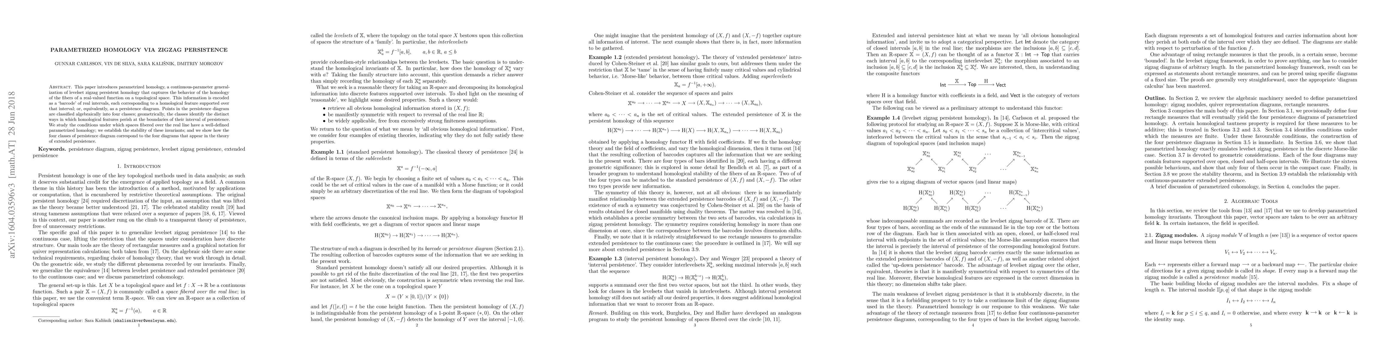 This paper introduces parametrized homology for 1-parameter families of topological spaces, using zigzag persistence to represent homological features as intervals. It classifies these intervals into four types, each indicating how features persist or vanish over the interval.