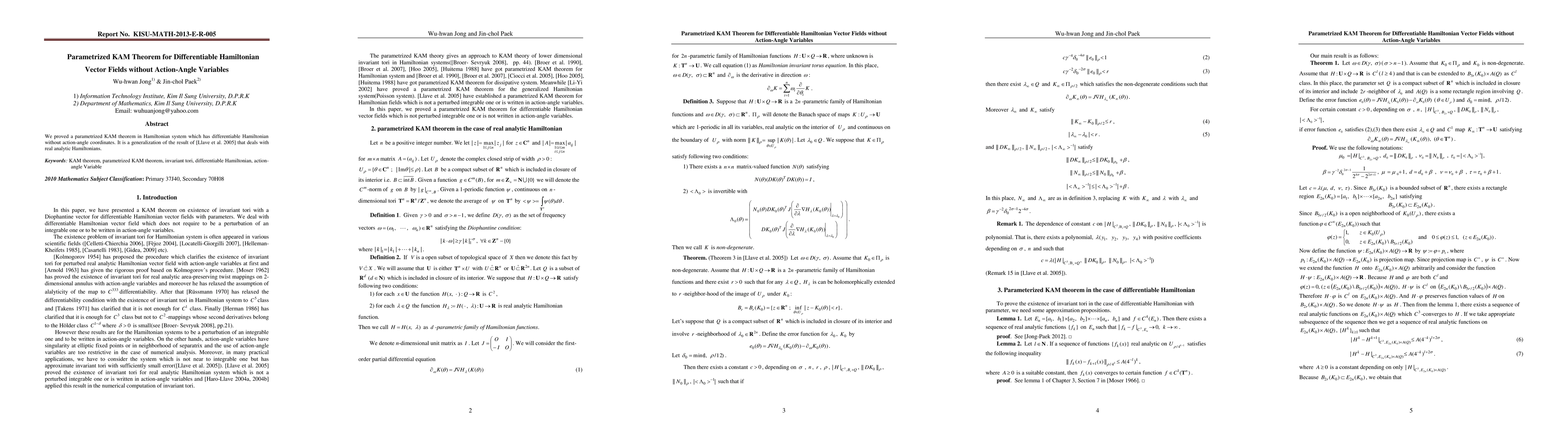 Summary: This paper presents a generalized parametrized KAM theorem for differentiable Hamiltonian systems without using action-angle variables, extending the results of Llave et al. (2005) for real analytic Hamiltonians.