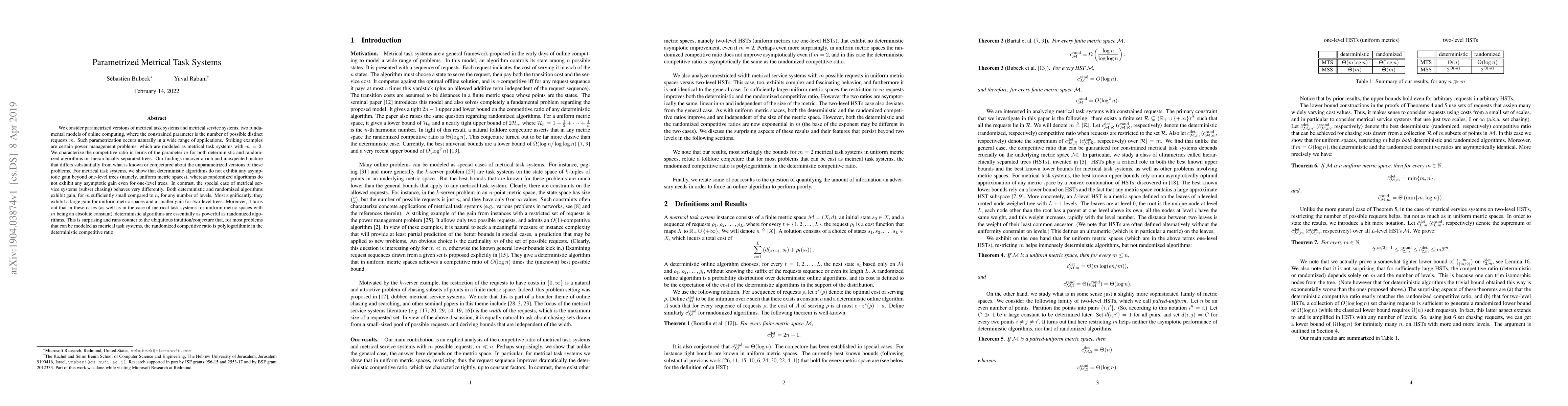 We consider parametrized versions of metrical task systems and metrical service systems, two fundamental models of online computing, where the constrained parameter is the number of possible distinct requests $m$. Such parametrization occurs naturally in a wide range of applications. Striking examples are certain power management problems, which are modeled as metrical task systems with $m=2$. We characterize the competitive ratio in terms of the parameter $m$ for both deterministic and randomized algorithms on hierarchically separated trees. Our findings uncover a rich and unexpected picture that differs substantially from what is known or conjectured about the unparametrized versions of these problems. For metrical task systems, we show that deterministic algorithms do not exhibit any asymptotic gain beyond one-level trees (namely, uniform metric spaces), whereas randomized algorithms do not exhibit any asymptotic gain even for one-level trees. In contrast, the special case of metrical service systems (subset chasing) behaves very differently. Both deterministic and randomized algorithms exhibit gain, for $m$ sufficiently small compared to $n$, for any number of levels. Most significantly, they exhibit a large gain for uniform metric spaces and a smaller gain for two-level trees. Moreover, it turns out that in these cases (as well as in the case of metrical task systems for uniform metric spaces with $m$ being an absolute constant), deterministic algorithms are essentially as powerful as randomized algorithms. This is surprising and runs counter to the ubiquitous intuition/conjecture that, for most problems that can be modeled as metrical task systems, the randomized competitive ratio is polylogarithmic in the deterministic competitive ratio.