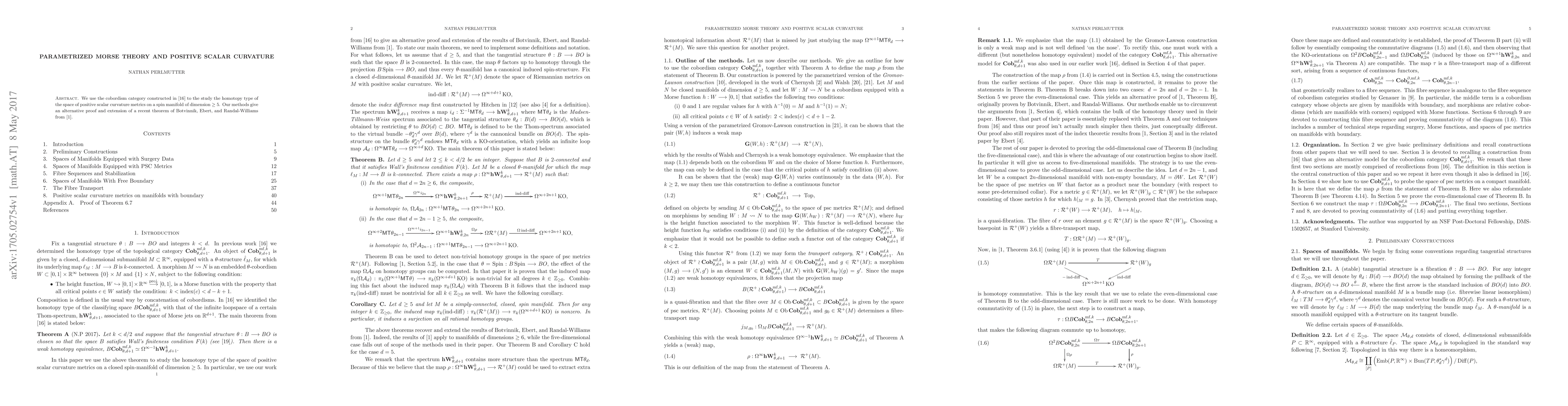 This paper applies parametrized Morse theory within the cobordism category to analyze the homotopy type of spaces with positive scalar curvature metrics on spin manifolds. It provides an alternative proof and extension of a theorem by Botvinnik, Ebert, and Randal-Williams.