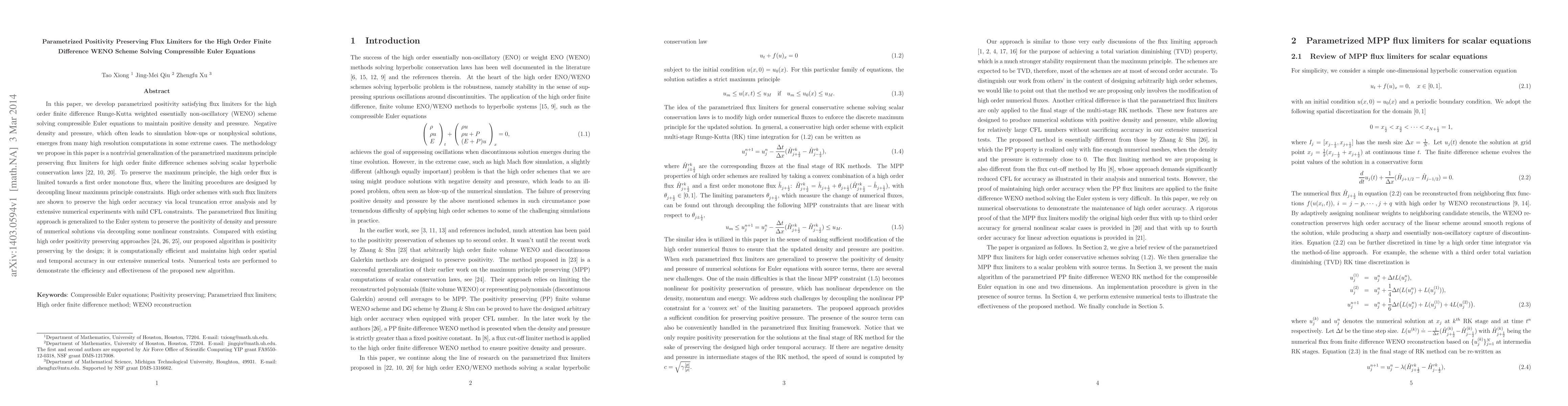This paper develops parametrized positivity preserving flux limiters for high order finite difference WENO schemes to solve the compressible Euler equations, ensuring positive density and pressure and preventing simulation blow-ups. The proposed method generalizes existing maximum principle preserving flux limiters for scalar hyperbolic conservation laws, achieving high order accuracy and computational efficiency.