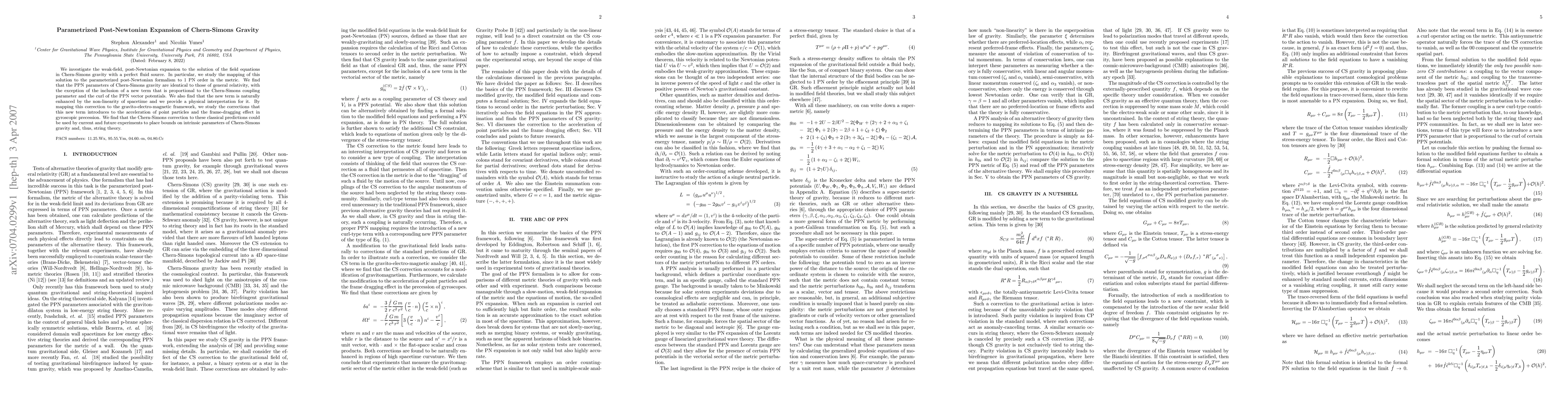 Researchers investigate Chern-Simons gravity, finding it shares PPN parameters with general relativity but introduces a new term that affects gravitational predictions, potentially providing bounds for testing string theory.