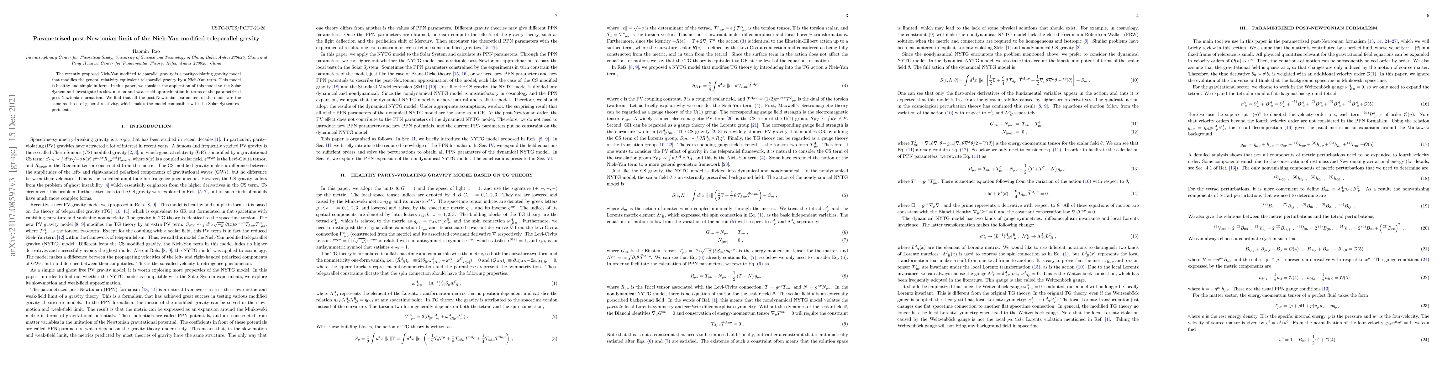 This paper examines the Nieh-Yan modified teleparallel gravity model, finding that its parametrized post-Newtonian parameters match those of general relativity, ensuring compatibility with Solar System experiments. The model remains a healthy and simple parity-violating alternative to general relativity.