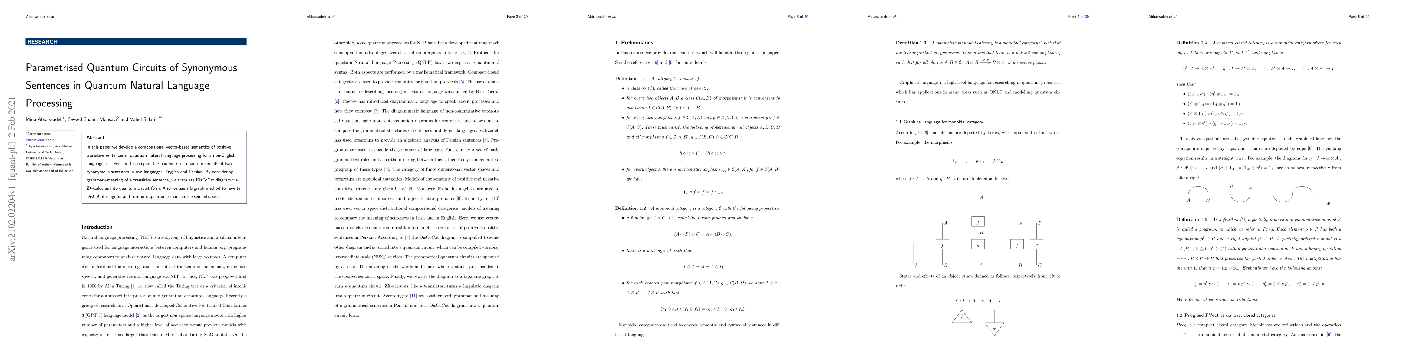 This paper develops a compositional vector-based semantics for positive transitive sentences in quantum natural language processing, specifically for Persian. It compares the parametrized quantum circuits of synonymous sentences in English and Persian, translating DisCoCat diagrams into quantum circuits using ZX-calculus and bigraph methods.