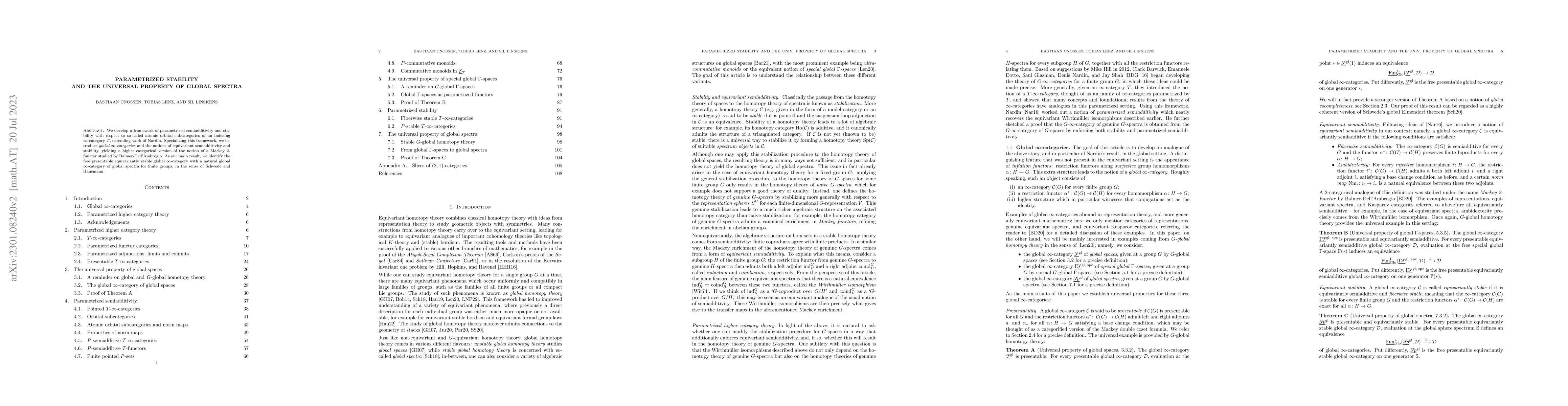 This paper establishes a framework for parametrized stability and semiadditivity in an $\infty$-category $T$, extending previous work. It introduces global $\infty$-categories and identifies the free presentable equivariantly stable global $\infty$-category with the global $\infty$-category of spectra for finite groups.