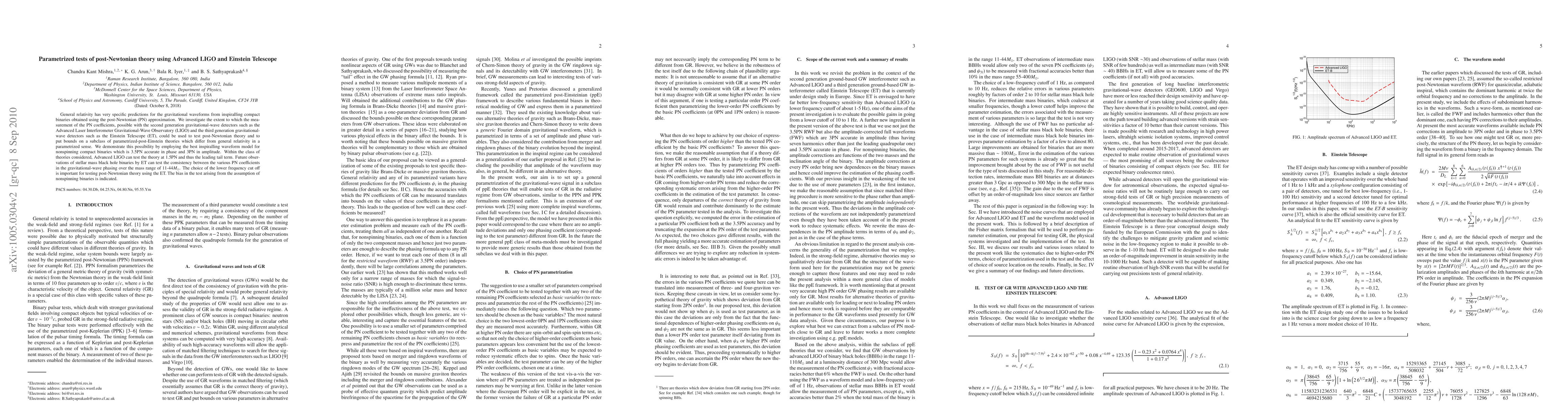 This paper explores how Advanced LIGO and the Einstein Telescope can measure post-Newtonian coefficients to test general relativity and its parametrized extensions. Advanced LIGO can test up to 1.5PN, while ET can test over a broader mass range, highlighting the importance of frequency cutoffs and the assumption of nonspinning binaries.