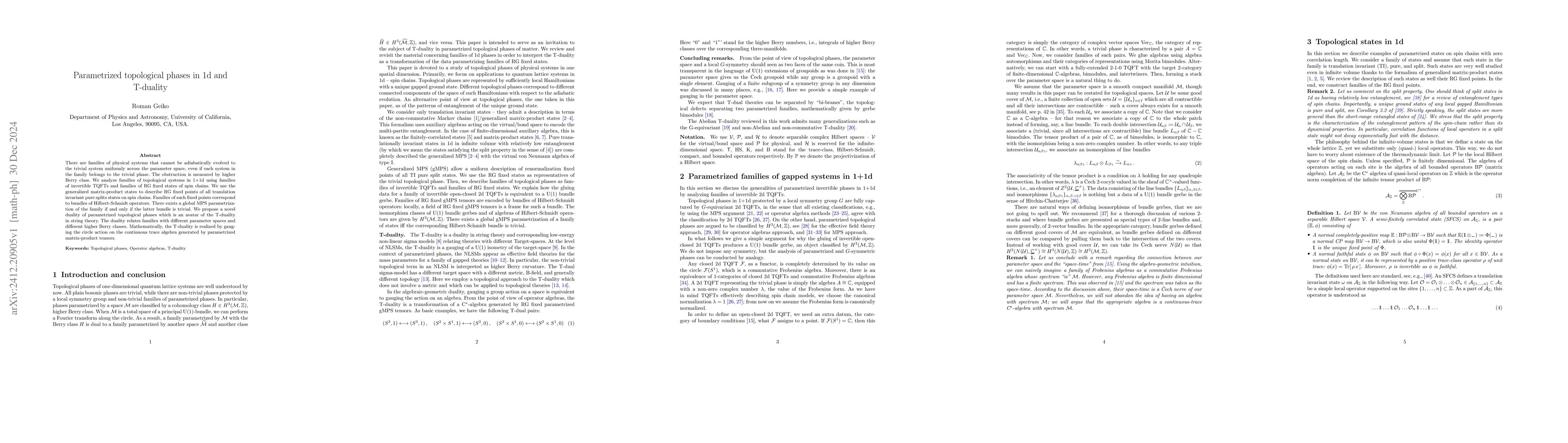 There are families of physical systems that cannot be adiabatically evolved to the trivial system uniformly across the parameter space, even if each system in the family belongs to the trivial phase. The obstruction is measured by higher Berry class. We analyze families of topological systems in 1+1d using families of invertible TQFTs and families of RG fixed states of spin chains. We use the generalized matrix-product states to describe RG fixed points of all translation invariant pure splits states on spin chains. Families of such fixed points correspond to bundles of Hilbert-Schmidt operators. There exists a global MPS parametrization of the family if and only if the latter bundle is trivial. We propose a novel duality of parametrized topological phases which is an avatar of the T-duality in string theory. The duality relates families with different parameter spaces and different higher Berry classes. Mathematically, the T-duality is realized by gauging the circle action on the continuous trace algebra generated by parametrized matrix-product tensors.