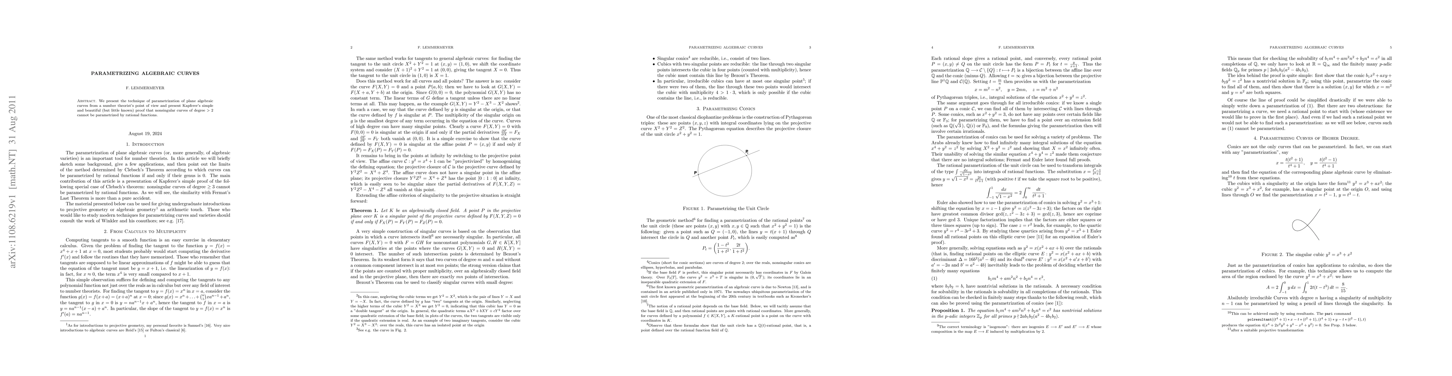 This paper introduces a method for parametrizing plane algebraic curves through a number theory lens and presents Kapferer's elegant proof that nonsingular curves of degree greater than 2 cannot be parametrized by rational functions.