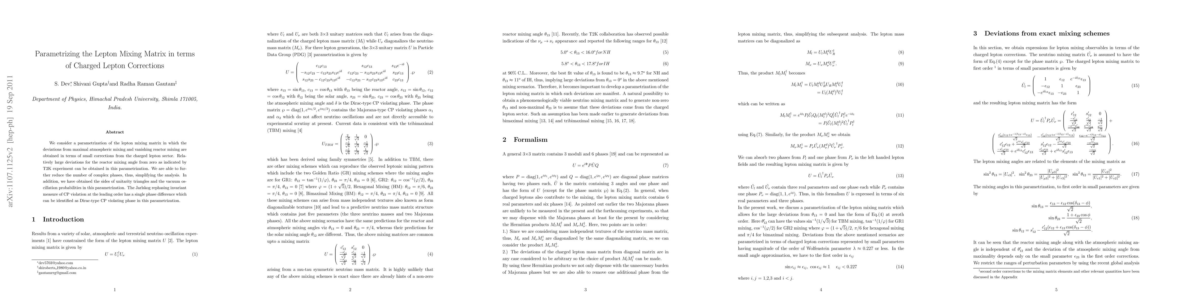 We consider a parametrization of the lepton mixing matrix in which the deviations from maximal atmospheric mixing and vanishing reactor mixing are obtained in terms of small corrections from the charged lepton sector. Relatively large deviations for the reactor mixing angle from zero as indicated by T2K experiment can be obtained in this parametrization. We are able to further reduce the number of complex phases, thus, simplifying the analysis. In addition, we have obtained the sides of unitarity triangles and the vacuum oscillation probabilities in this parametrization. The Jarlskog rephasing invariant measure of CP violation at the leading order has a single phase difference which can be identified as Dirac-type CP violating phase in this parametrization.